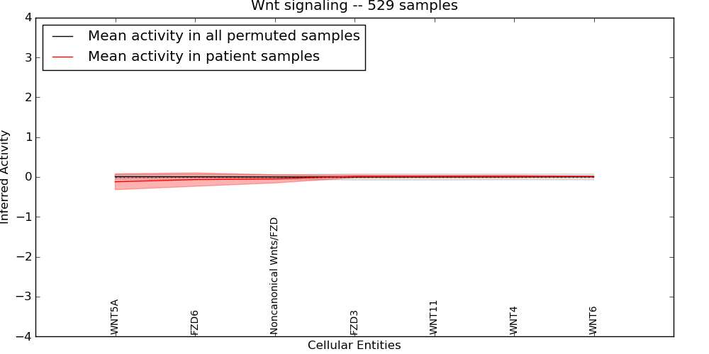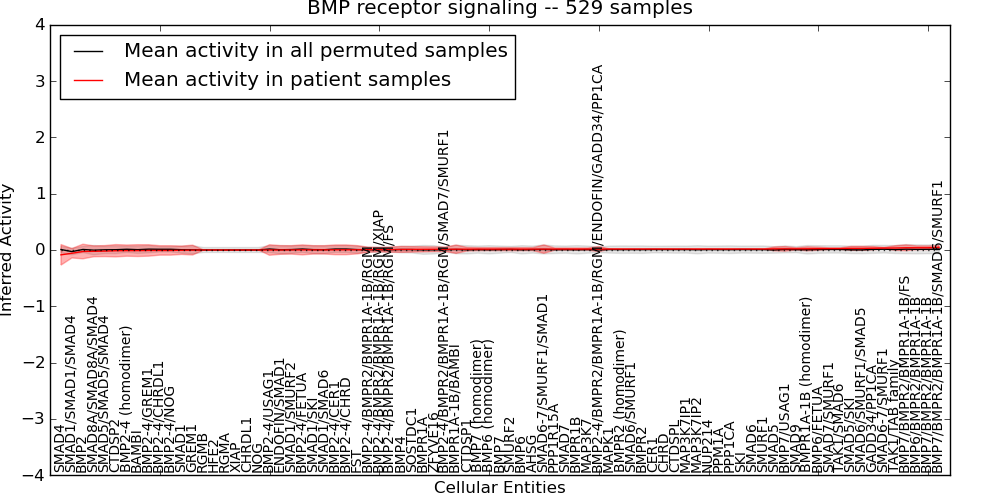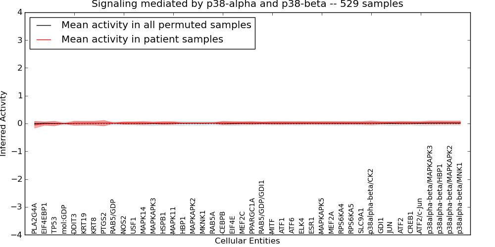 Figure S128. Get High-res Image This plot shows pathway concept perturbations across all samples against a permutation model. The concepts along the x-axis are sorted by lowest to highest mean activity for the real patient samples. Mean inferred activities are plotted along the y-axis as a colored band showing the average level and one standard deviation range. Real samples are shown in red and permuted samples in black.