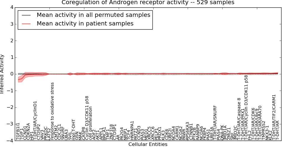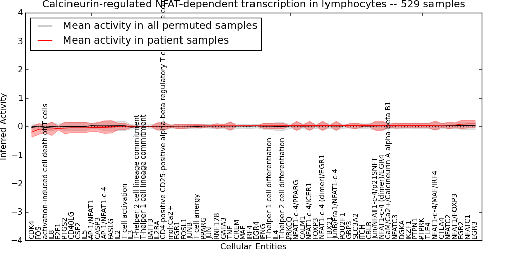 Figure S127. Get High-res Image This plot shows pathway concept perturbations across all samples against a permutation model. The concepts along the x-axis are sorted by lowest to highest mean activity for the real patient samples. Mean inferred activities are plotted along the y-axis as a colored band showing the average level and one standard deviation range. Real samples are shown in red and permuted samples in black.