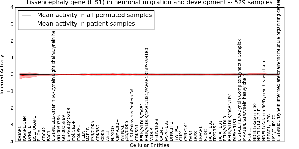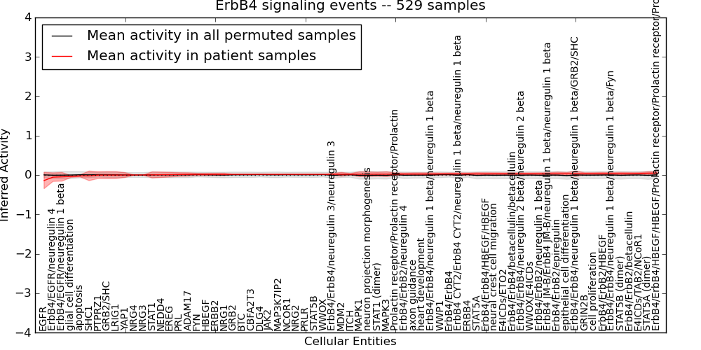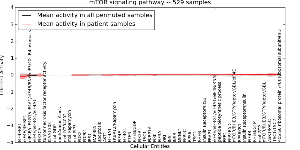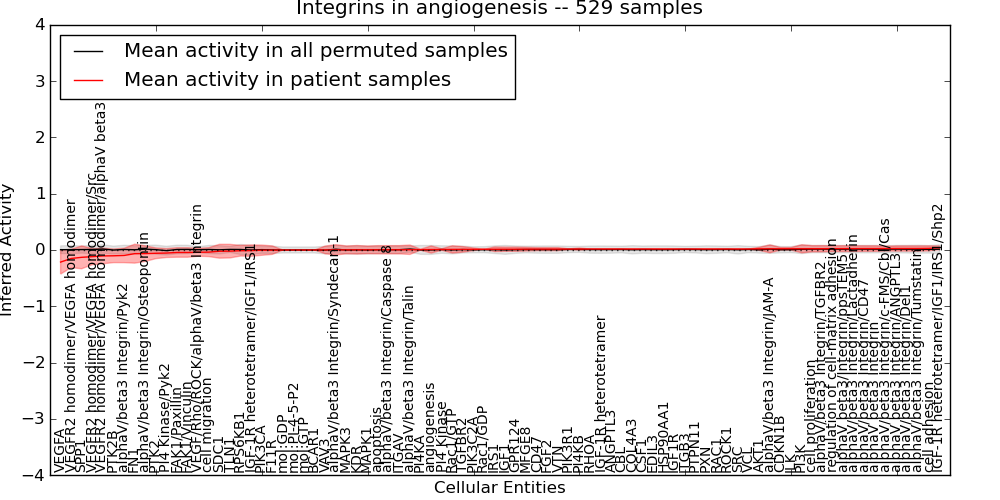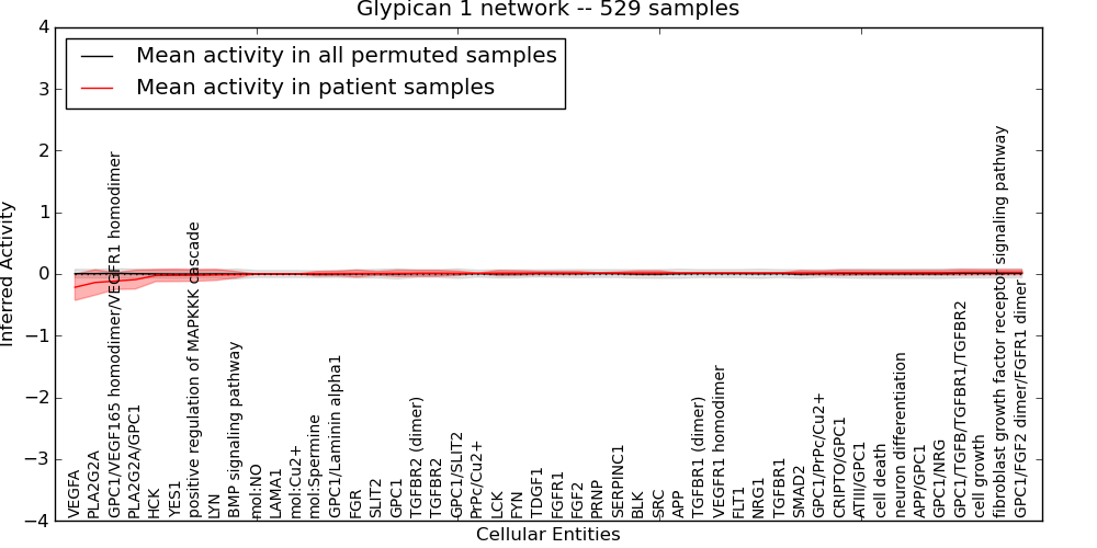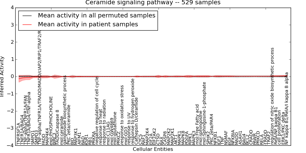 Figure S131. Get High-res Image This plot shows pathway concept perturbations across all samples against a permutation model. The concepts along the x-axis are sorted by lowest to highest mean activity for the real patient samples. Mean inferred activities are plotted along the y-axis as a colored band showing the average level and one standard deviation range. Real samples are shown in red and permuted samples in black.