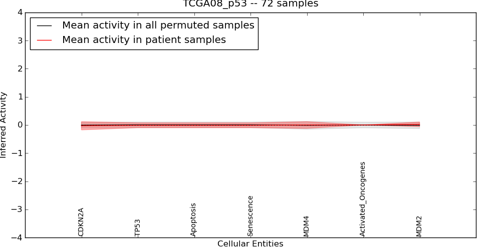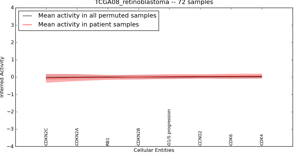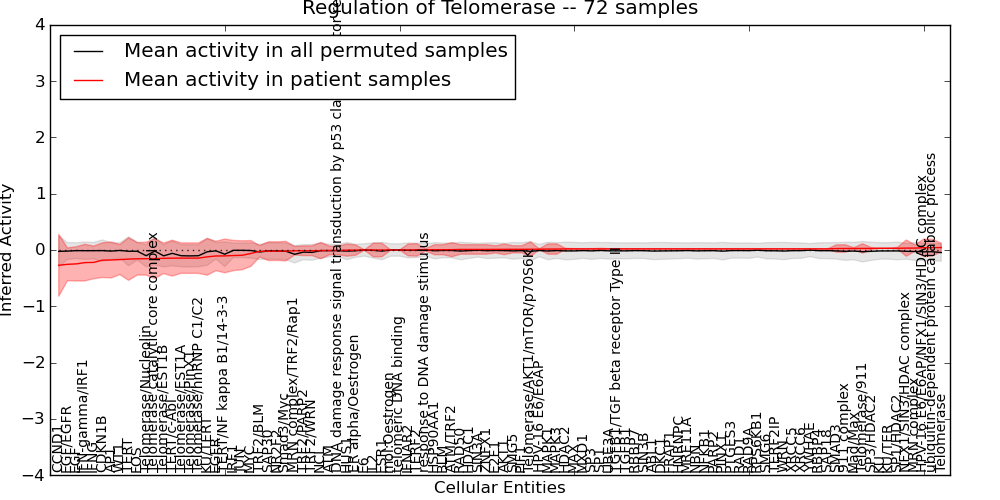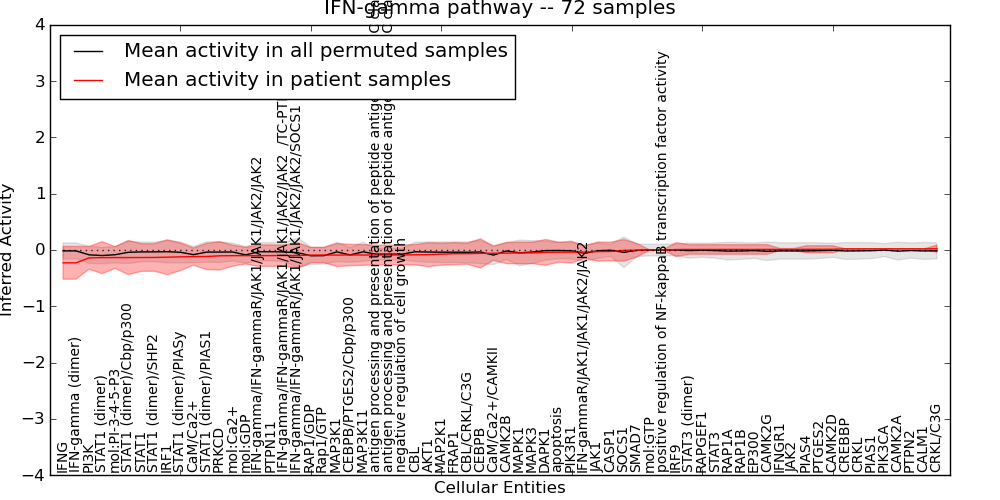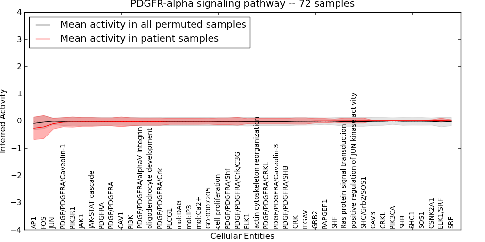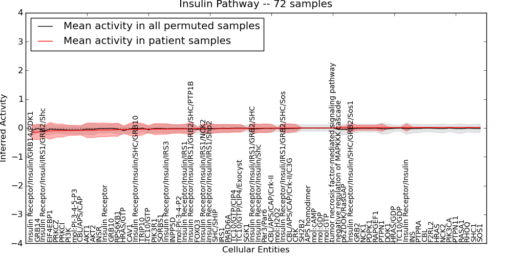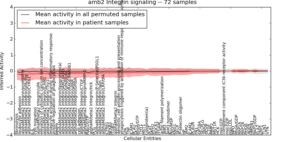 Figure S131. Get High-res Image This plot shows pathway concept perturbations across all samples against a permutation model. The concepts along the x-axis are sorted by lowest to highest mean activity for the real patient samples. Mean inferred activities are plotted along the y-axis as a colored band showing the average level and one standard deviation range. Real samples are shown in red and permuted samples in black.