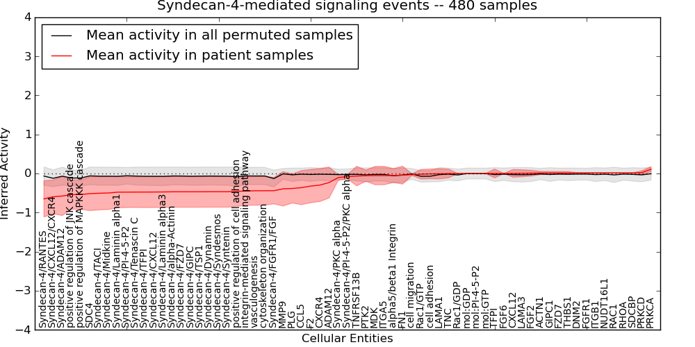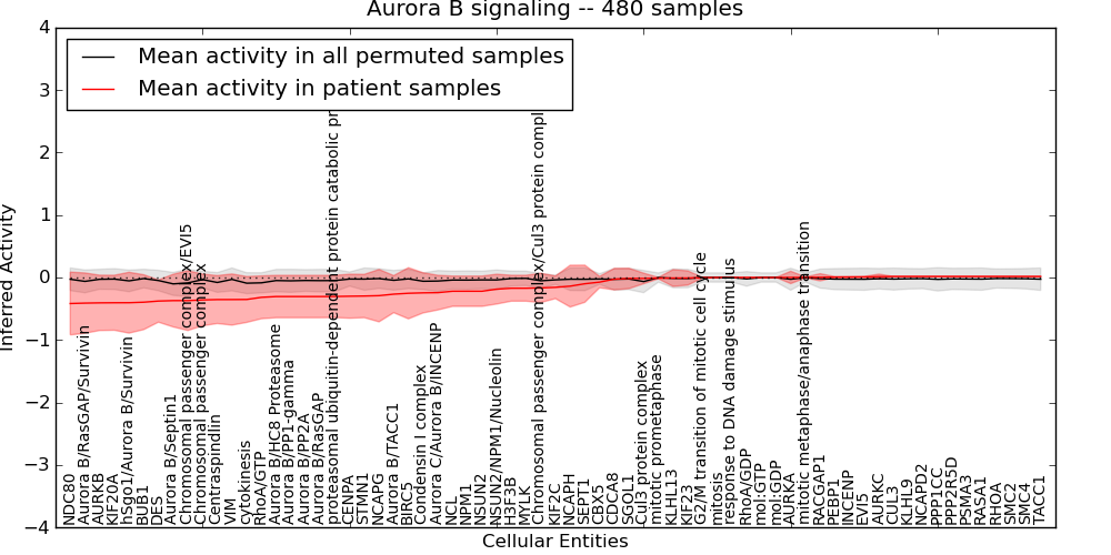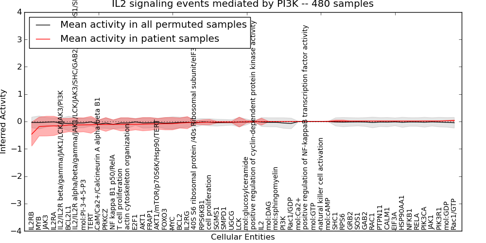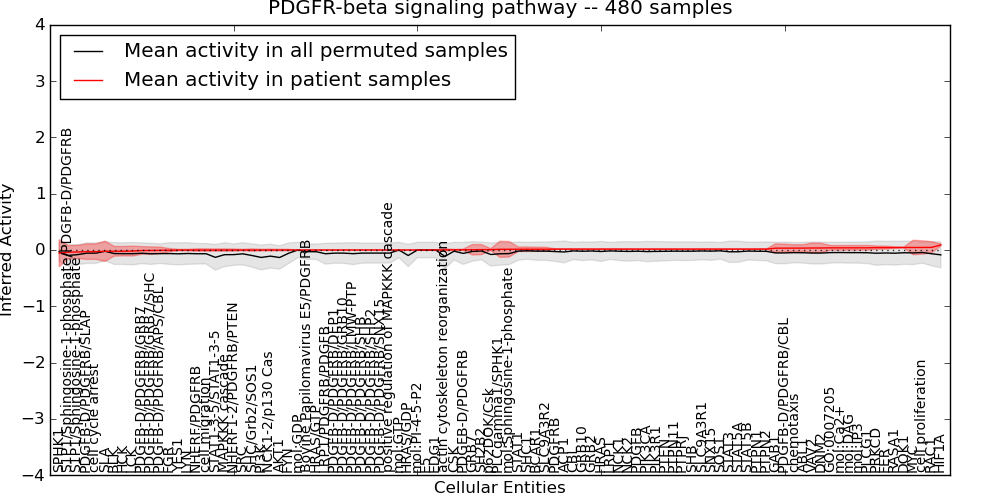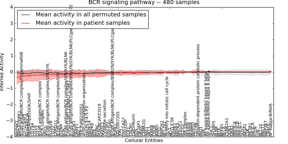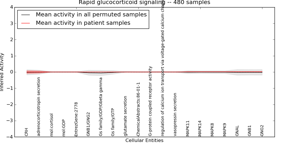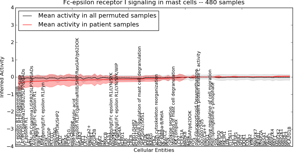 Figure S131. Get High-res Image This plot shows pathway concept perturbations across all samples against a permutation model. The concepts along the x-axis are sorted by lowest to highest mean activity for the real patient samples. Mean inferred activities are plotted along the y-axis as a colored band showing the average level and one standard deviation range. Real samples are shown in red and permuted samples in black.