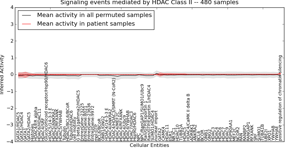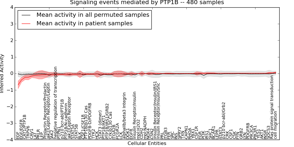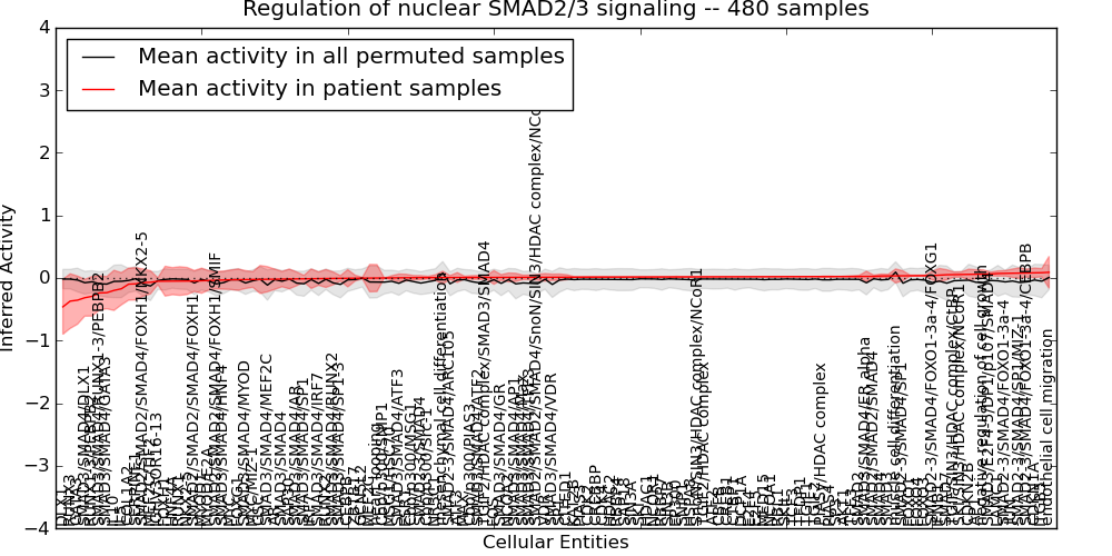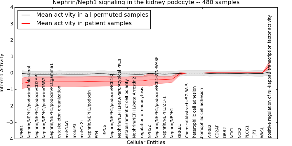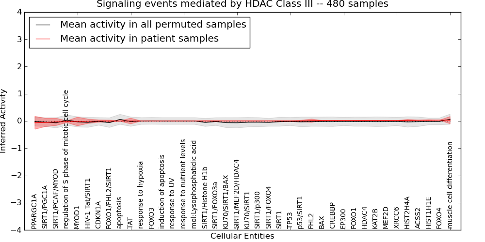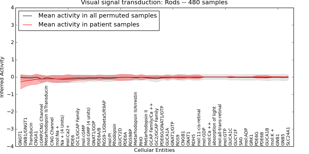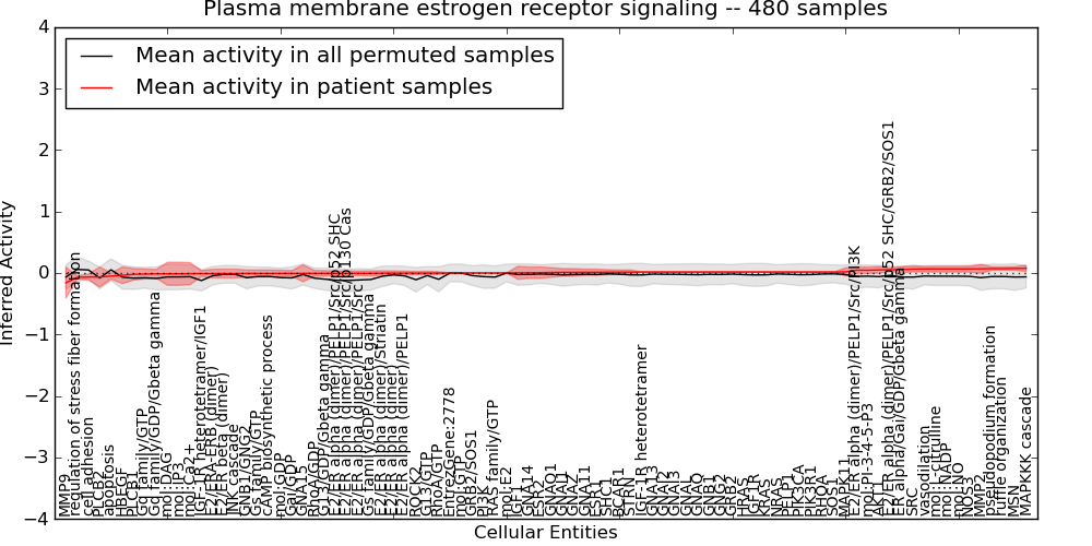Figure S131. Get High-res Image This plot shows pathway concept perturbations across all samples against a permutation model. The concepts along the x-axis are sorted by lowest to highest mean activity for the real patient samples. Mean inferred activities are plotted along the y-axis as a colored band showing the average level and one standard deviation range. Real samples are shown in red and permuted samples in black.