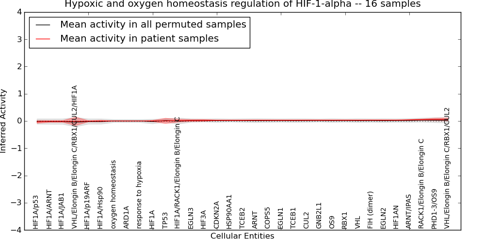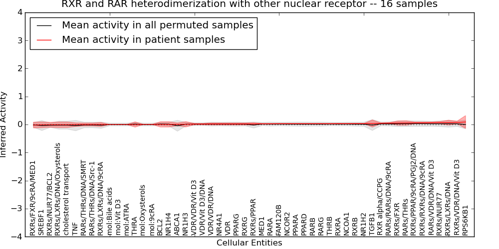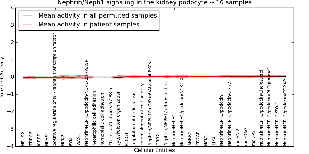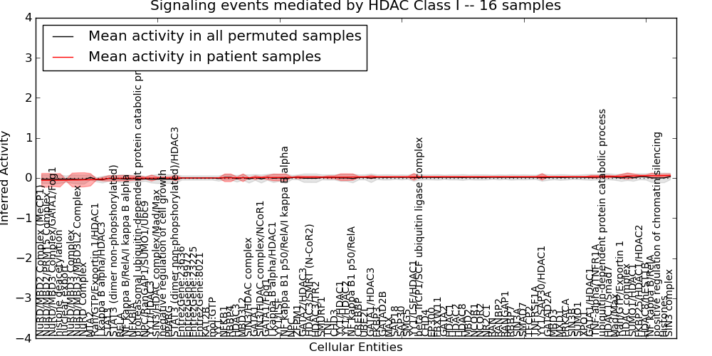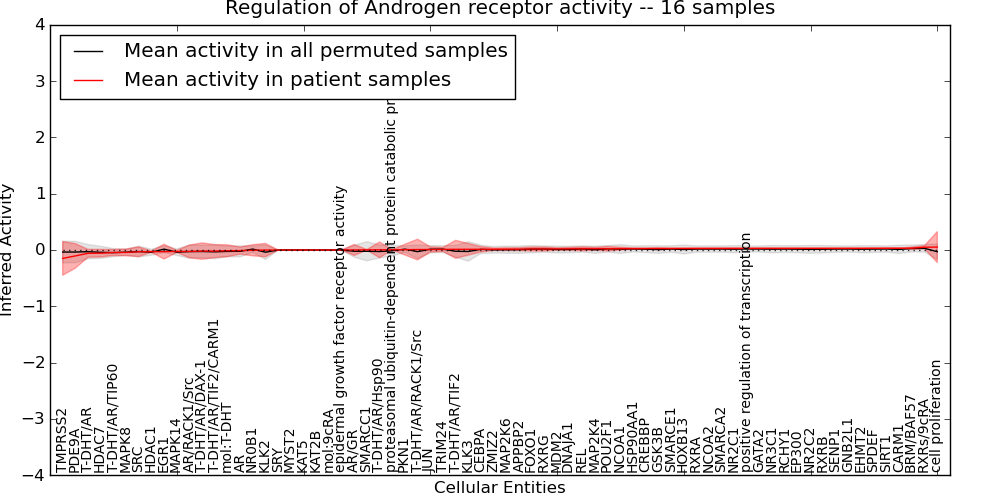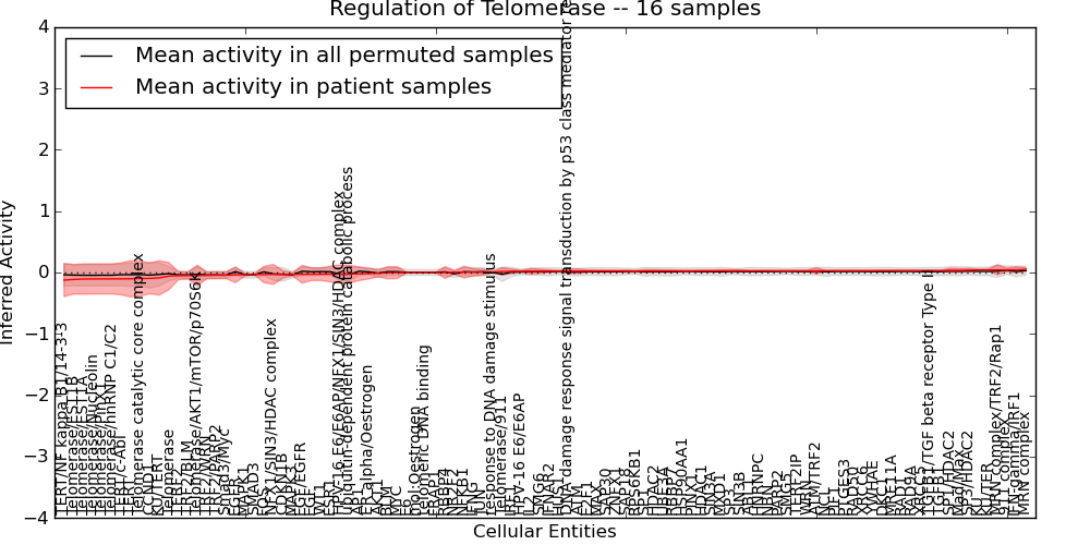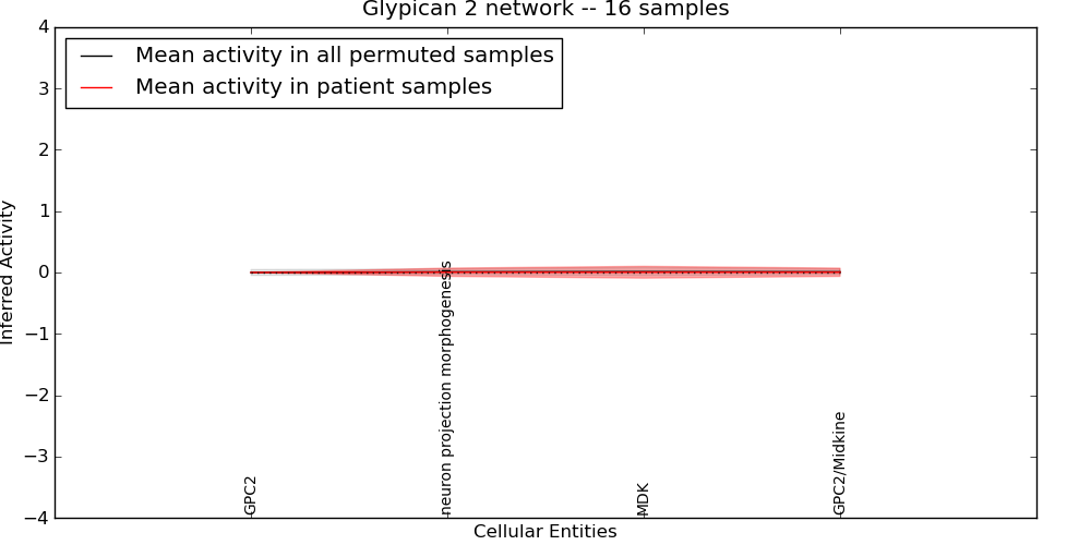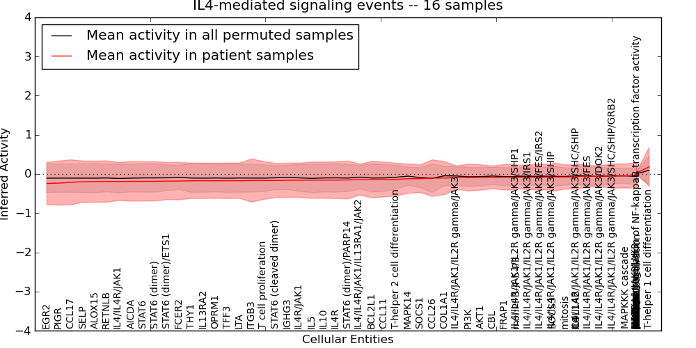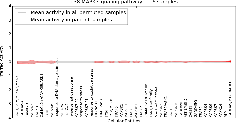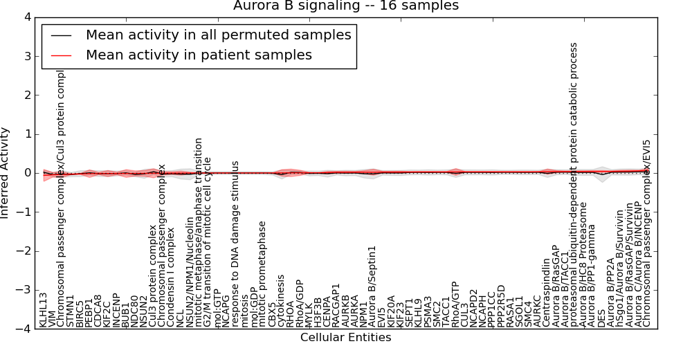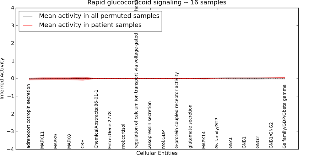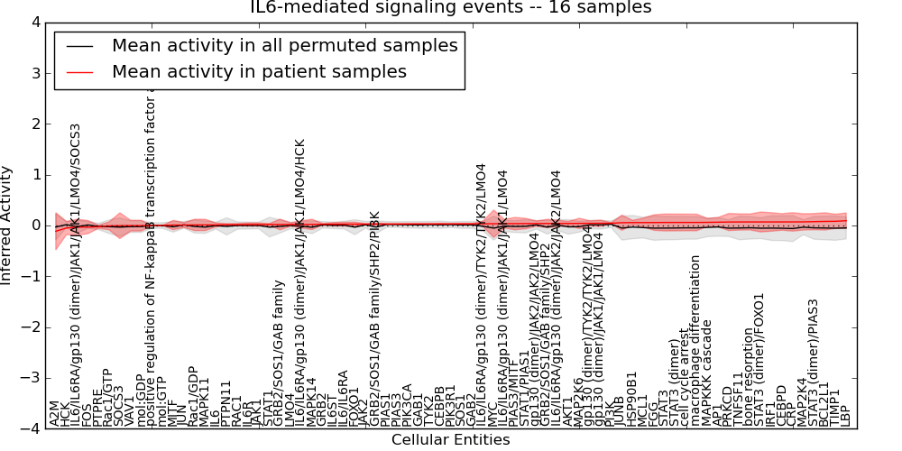 Figure S131.  Get High-res Image This plot shows pathway concept perturbations across all samples against a permutation model. The concepts along the x-axis are sorted by lowest to highest mean activity for the real patient samples. Mean inferred activities are plotted along the y-axis as a colored band showing the average level and one standard deviation range. Real samples are shown in red and permuted samples in black.