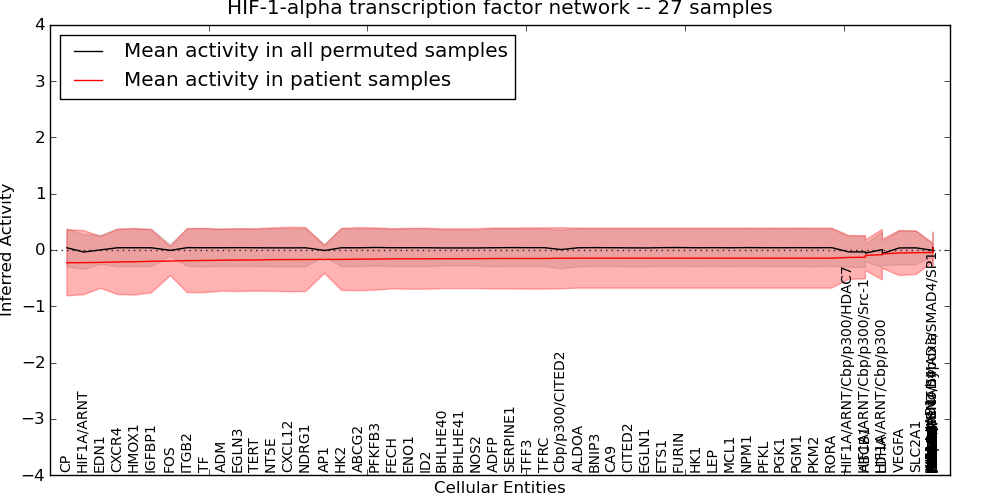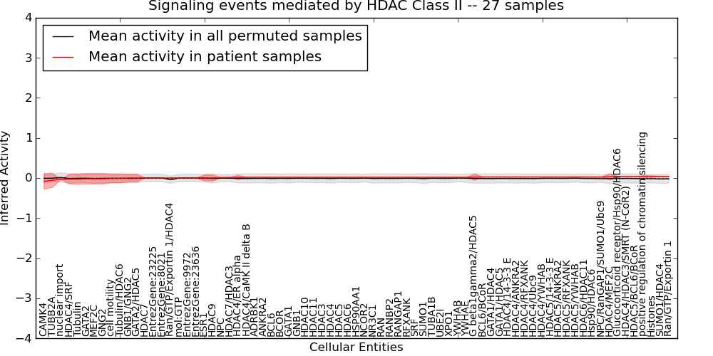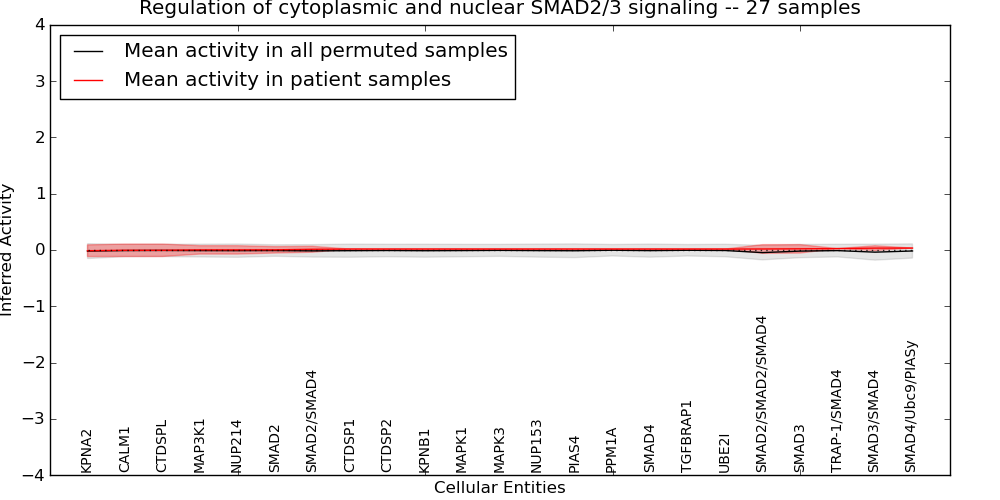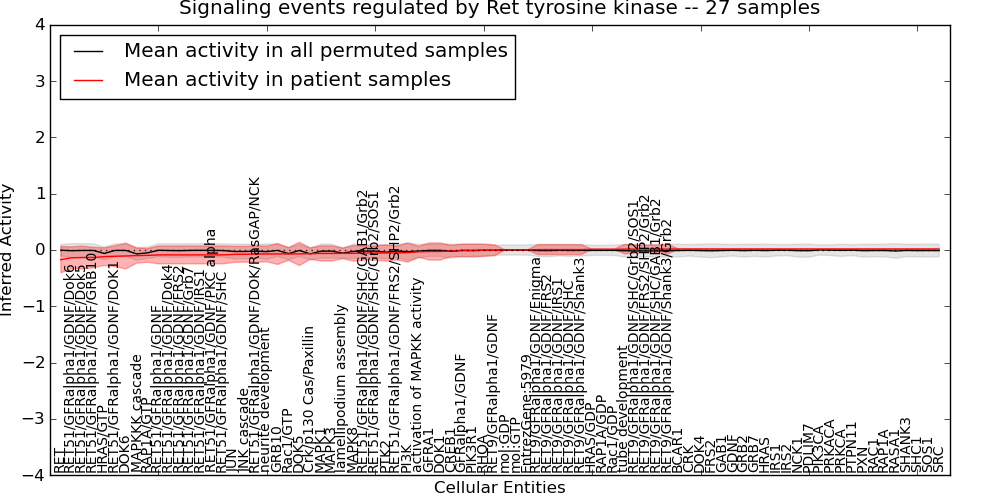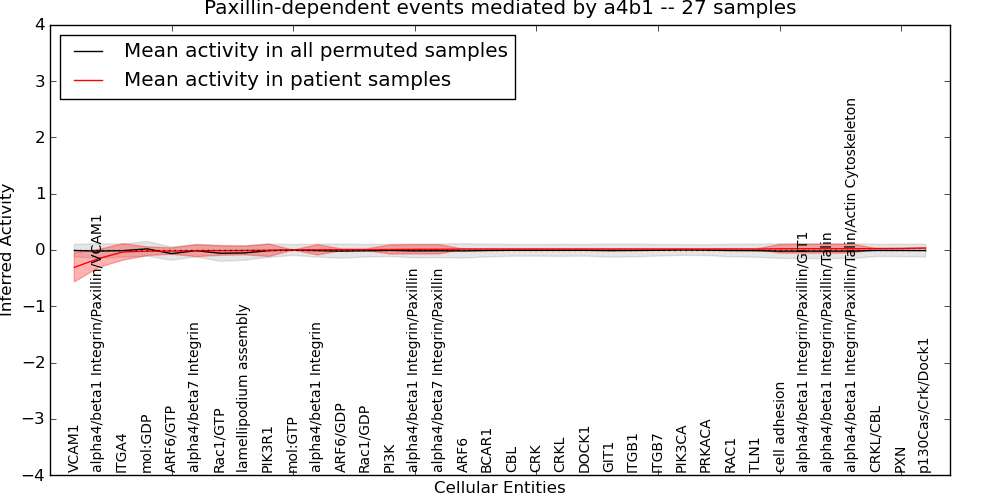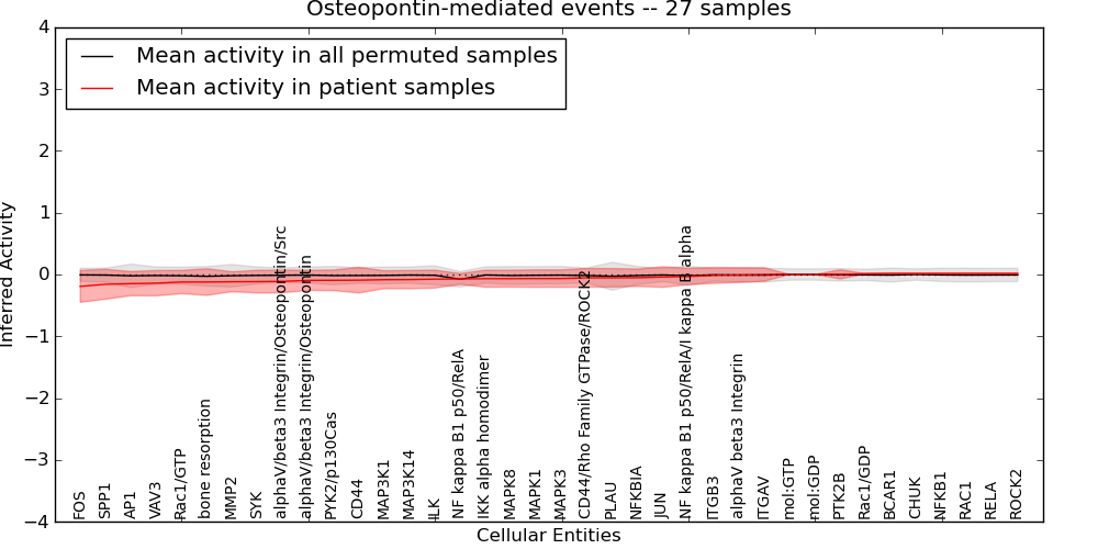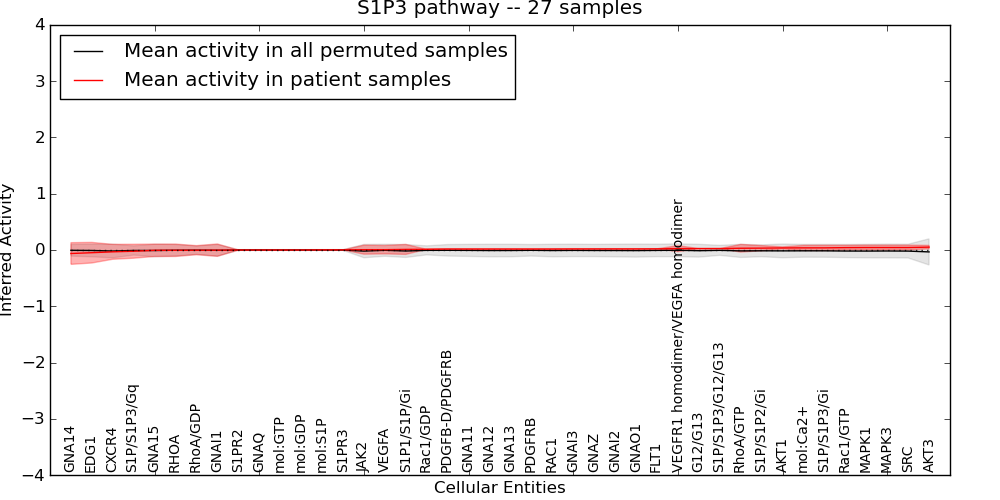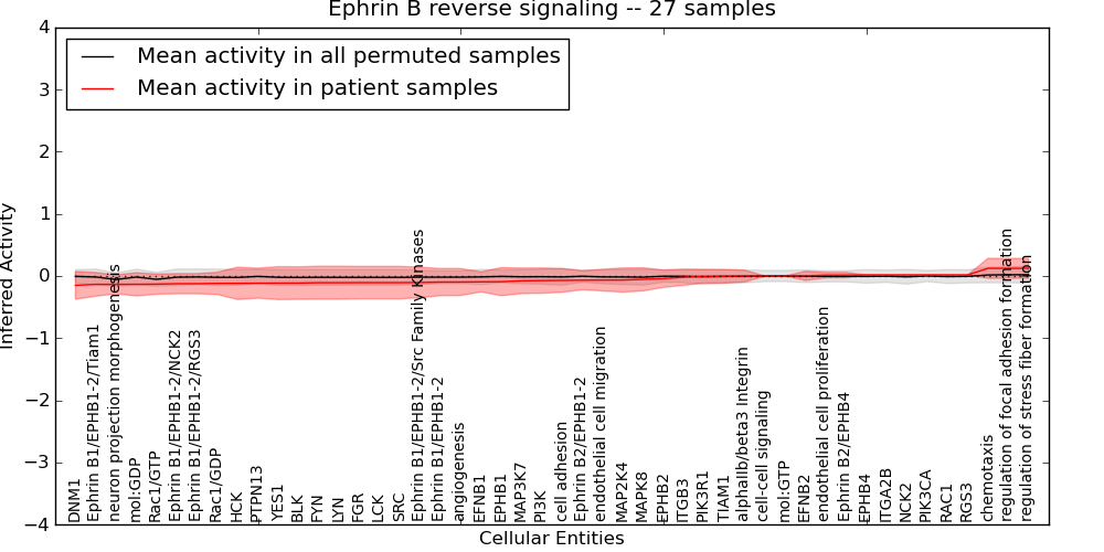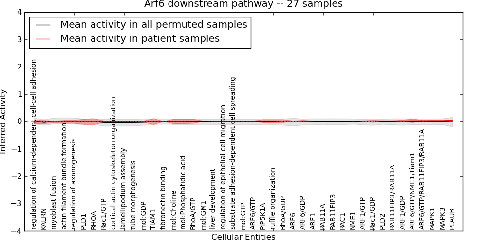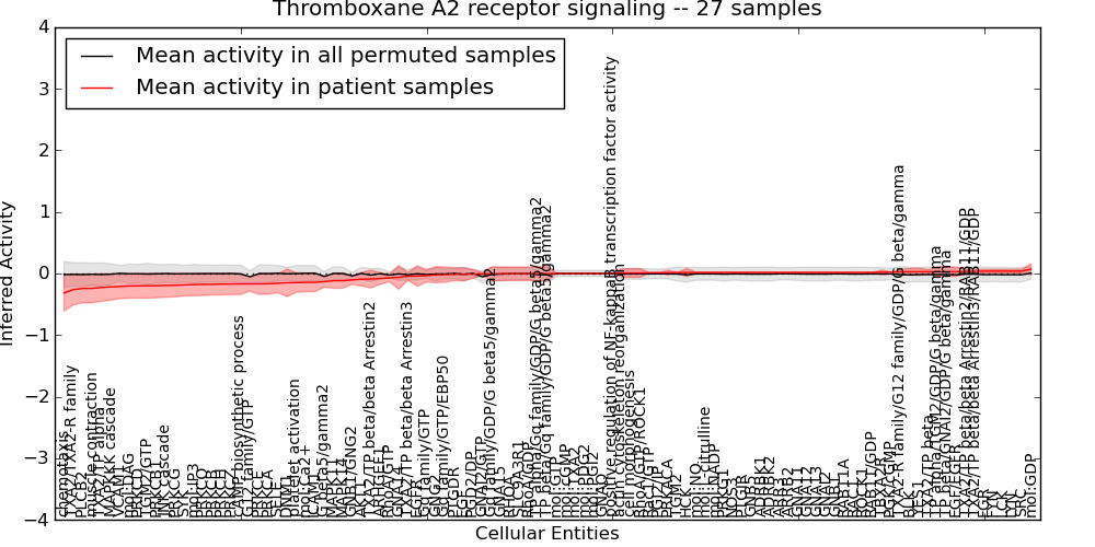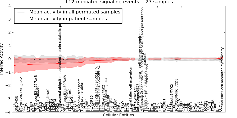 Figure S131.  Get High-res Image This plot shows pathway concept perturbations across all samples against a permutation model. The concepts along the x-axis are sorted by lowest to highest mean activity for the real patient samples. Mean inferred activities are plotted along the y-axis as a colored band showing the average level and one standard deviation range. Real samples are shown in red and permuted samples in black.