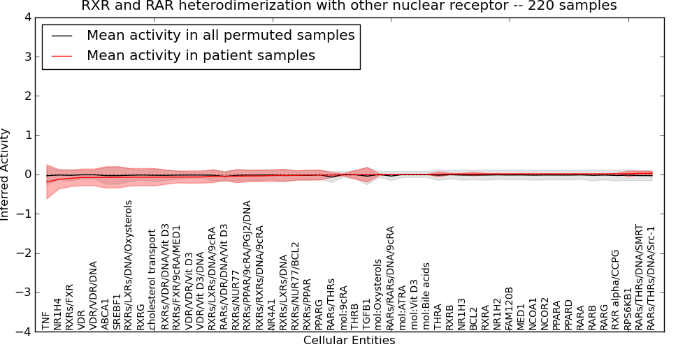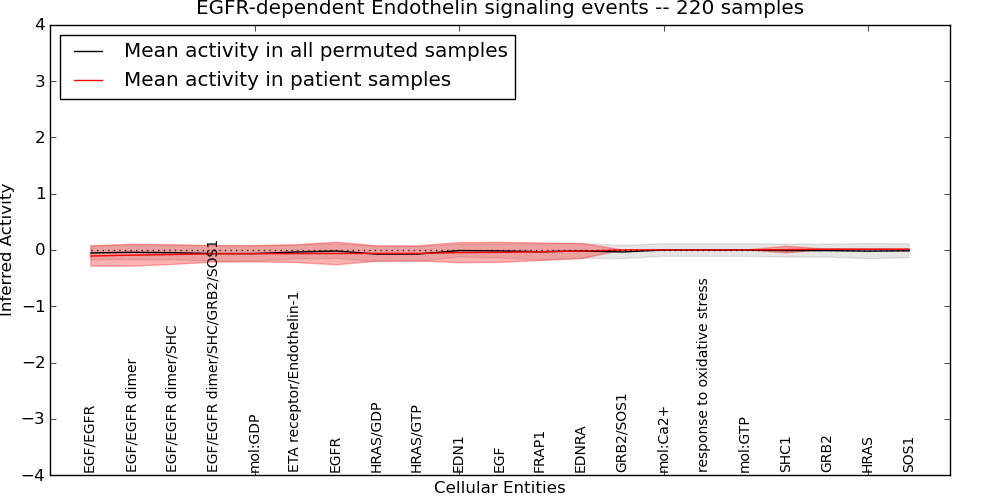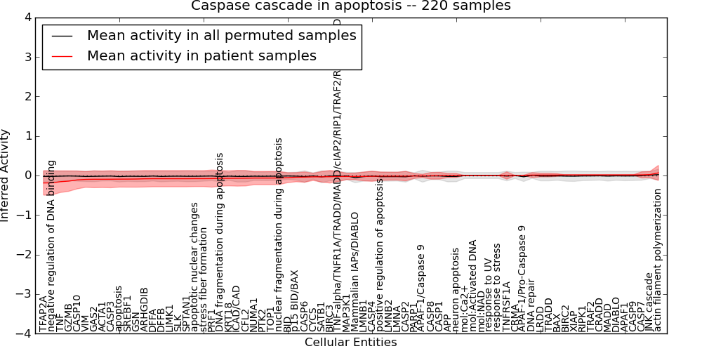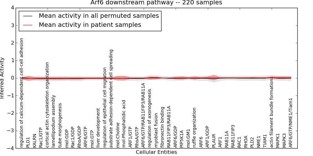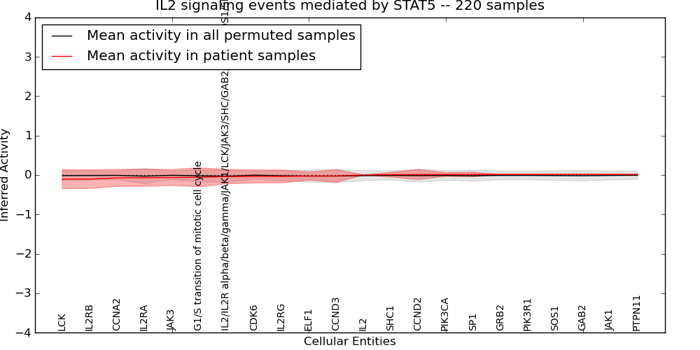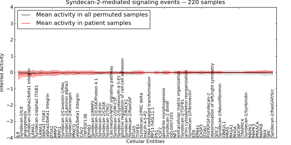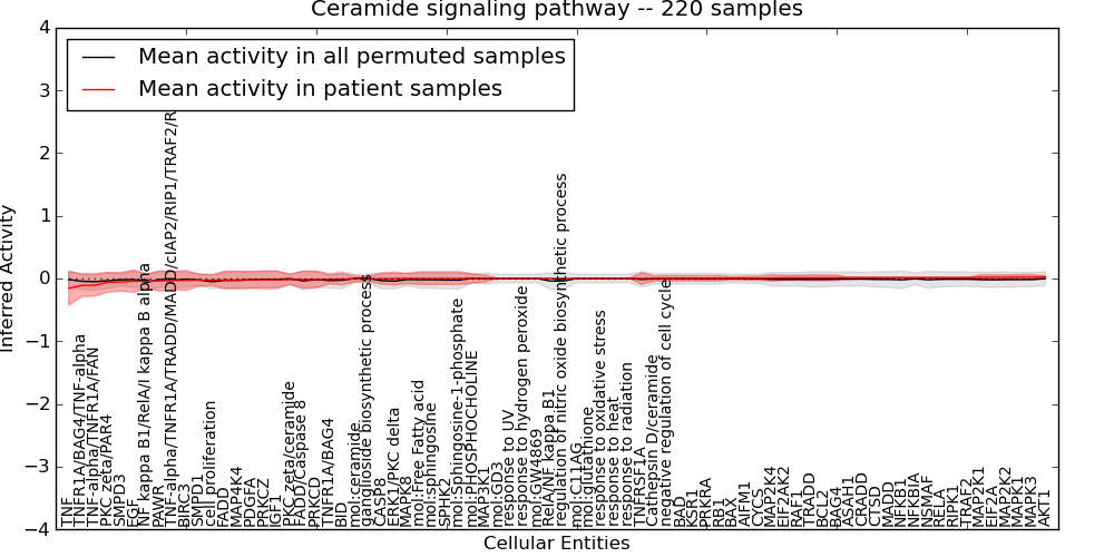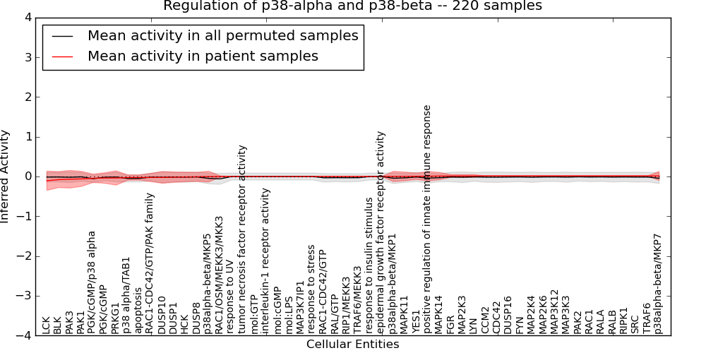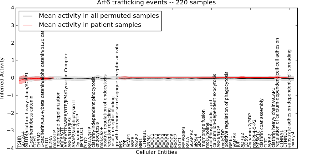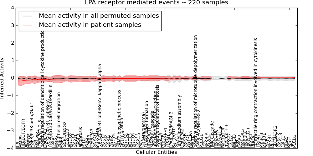 Figure S131. Get High-res Image This plot shows pathway concept perturbations across all samples against a permutation model. The concepts along the x-axis are sorted by lowest to highest mean activity for the real patient samples. Mean inferred activities are plotted along the y-axis as a colored band showing the average level and one standard deviation range. Real samples are shown in red and permuted samples in black.