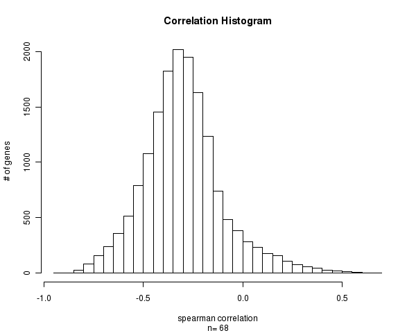 Figure 1. Histogram of methylation correlation values. n is the number of matched samples between Level 3 CpG site methylation and Level 3 gene expression arrays. Number of Matched Samples = 68
