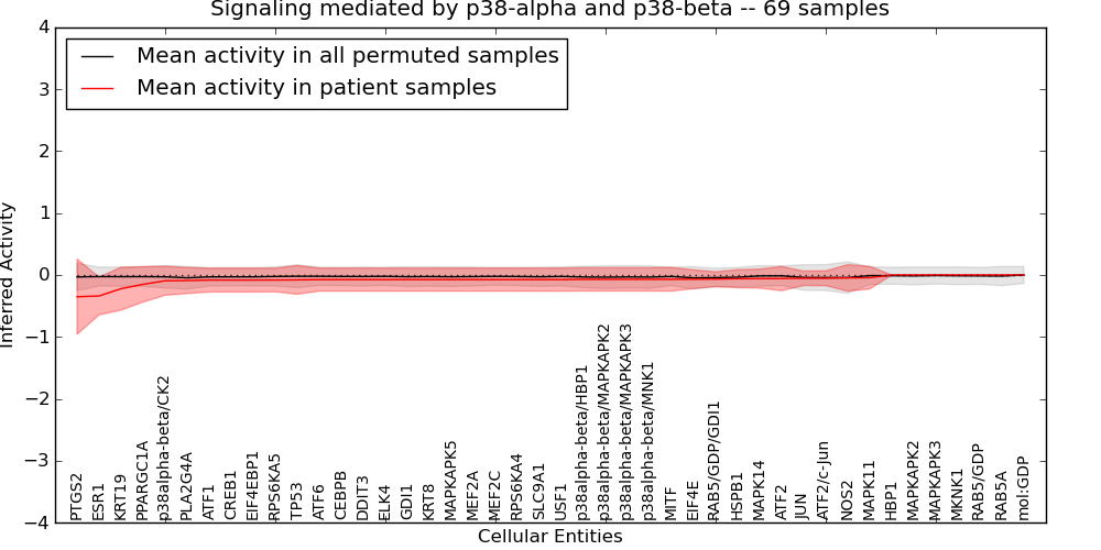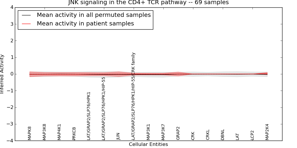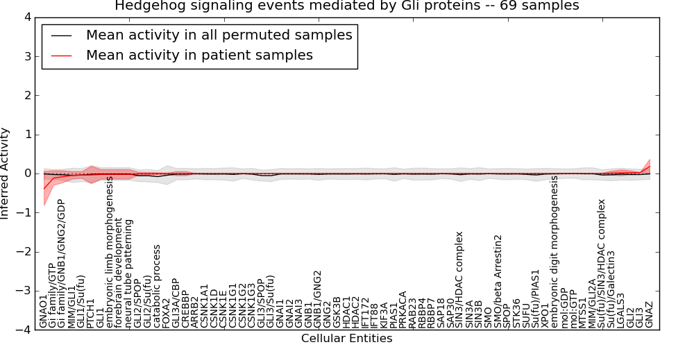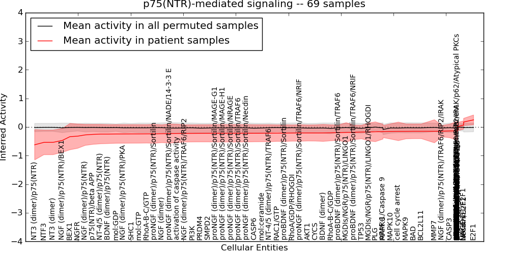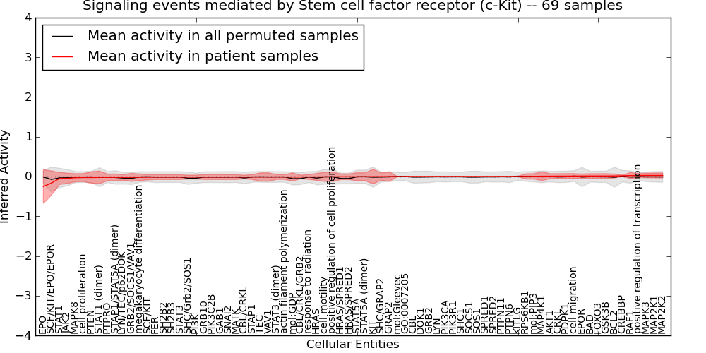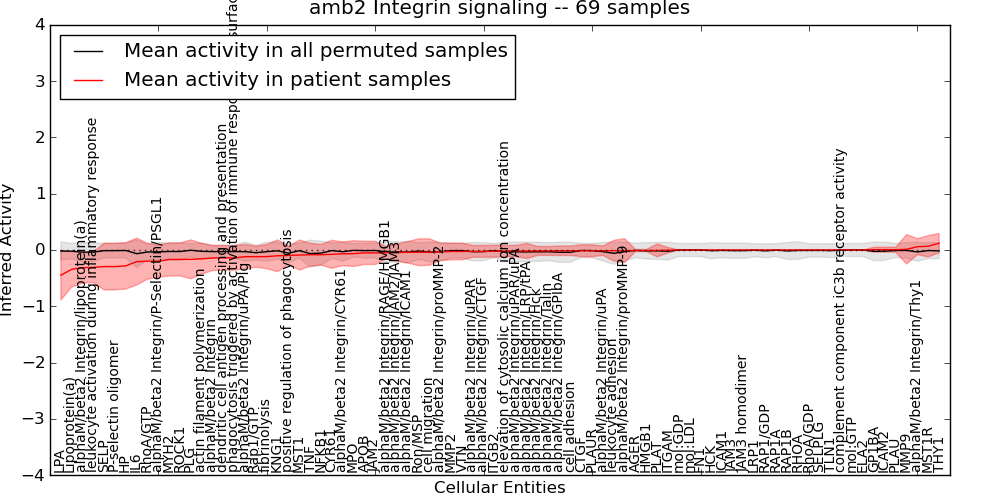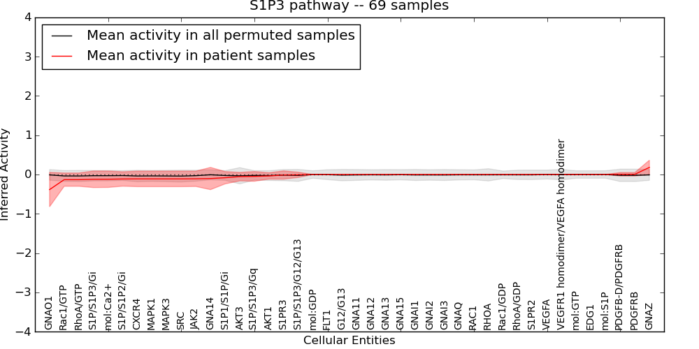 Figure S131. Get High-res Image This plot shows pathway concept perturbations across all samples against a permutation model. The concepts along the x-axis are sorted by lowest to highest mean activity for the real patient samples. Mean inferred activities are plotted along the y-axis as a colored band showing the average level and one standard deviation range. Real samples are shown in red and permuted samples in black.