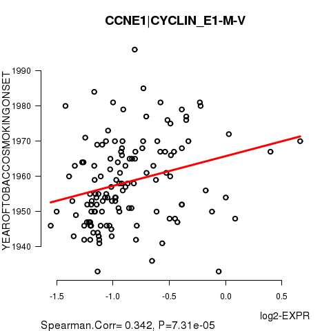 Figure S7. Get High-res Image As an example, this figure shows the association of CCNE1|CYCLIN_E1-M-V to 'YEAROFTOBACCOSMOKINGONSET'. P value = 7.31e-05 with Spearman correlation analysis. The straight line presents the best linear regression.