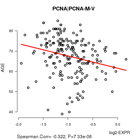 Figure S2. Get High-res Image As an example, this figure shows the association of PCNA|PCNA-M-V to 'AGE'. P value = 7.33e-06 with Spearman correlation analysis. The straight line presents the best linear regression.