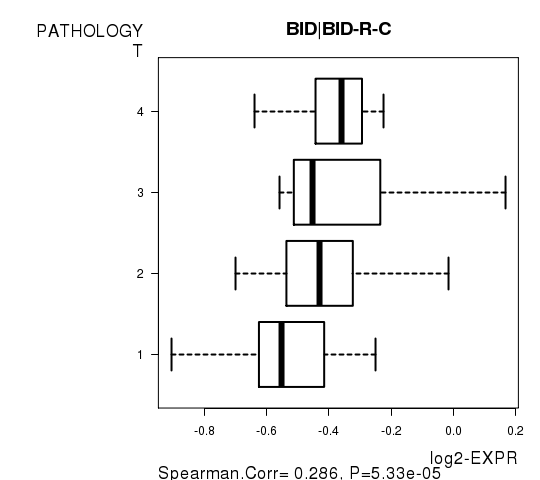 Figure S4. Get High-res Image As an example, this figure shows the association of BID|BID-R-C to 'PATHOLOGY.T'. P value = 5.33e-05 with Spearman correlation analysis.