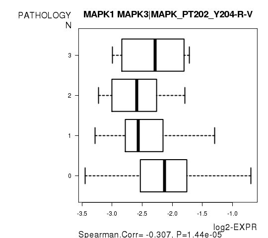 Figure S5. Get High-res Image As an example, this figure shows the association of MAPK1 MAPK3|MAPK_PT202_Y204-R-V to 'PATHOLOGY.N'. P value = 1.44e-05 with Spearman correlation analysis.