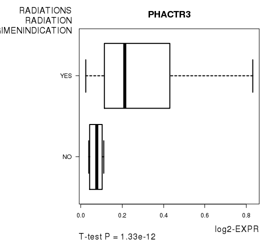 Figure S5. Get High-res Image As an example, this figure shows the association of PHACTR3 to 'RADIATIONS.RADIATION.REGIMENINDICATION'. P value = 1.33e-12 with T-test analysis.