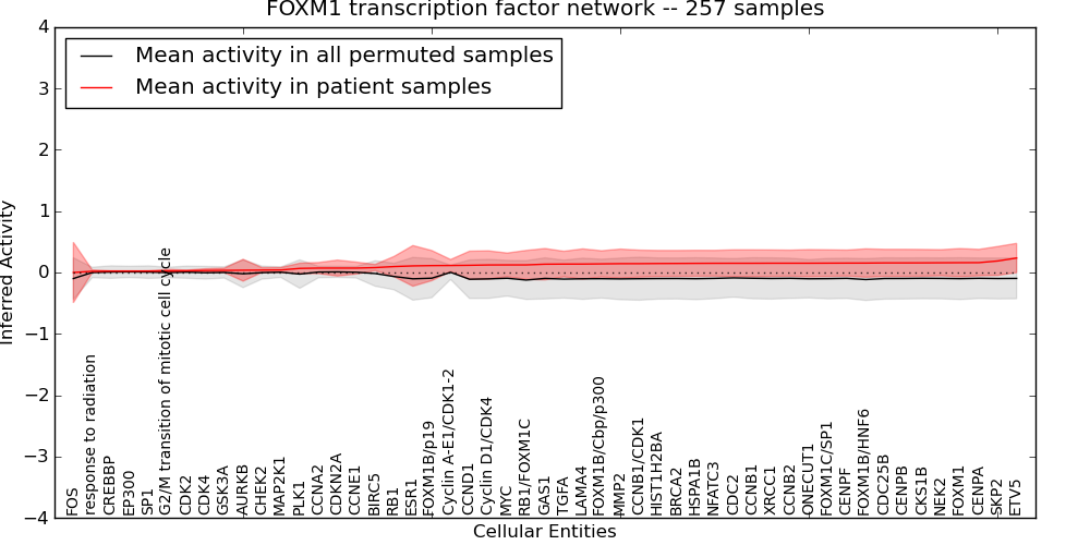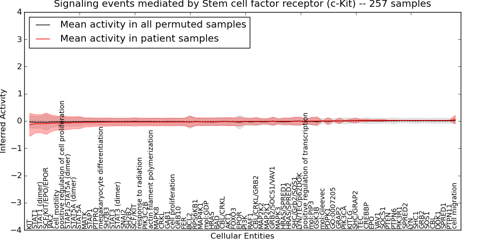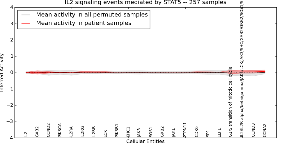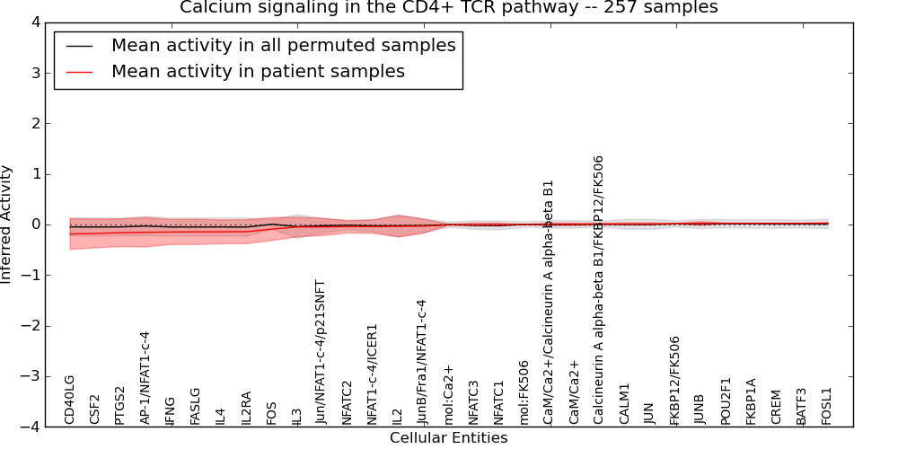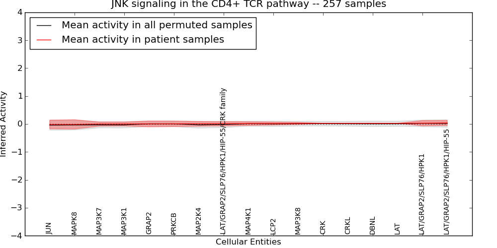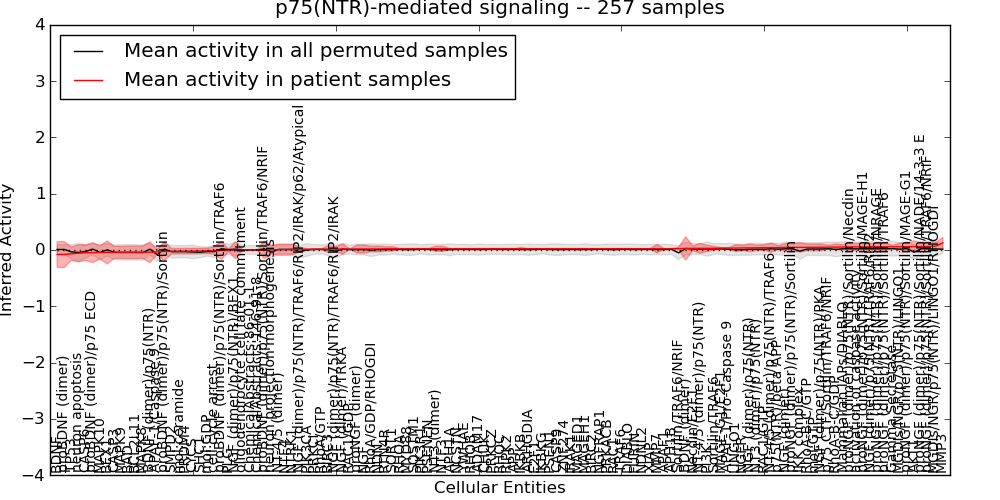 Figure S129. Get High-res Image This plot shows pathway concept perturbations across all samples against a permutation model. The concepts along the x-axis are sorted by lowest to highest mean activity for the real patient samples. Mean inferred activities are plotted along the y-axis as a colored band showing the average level and one standard deviation range. Real samples are shown in red and permuted samples in black.