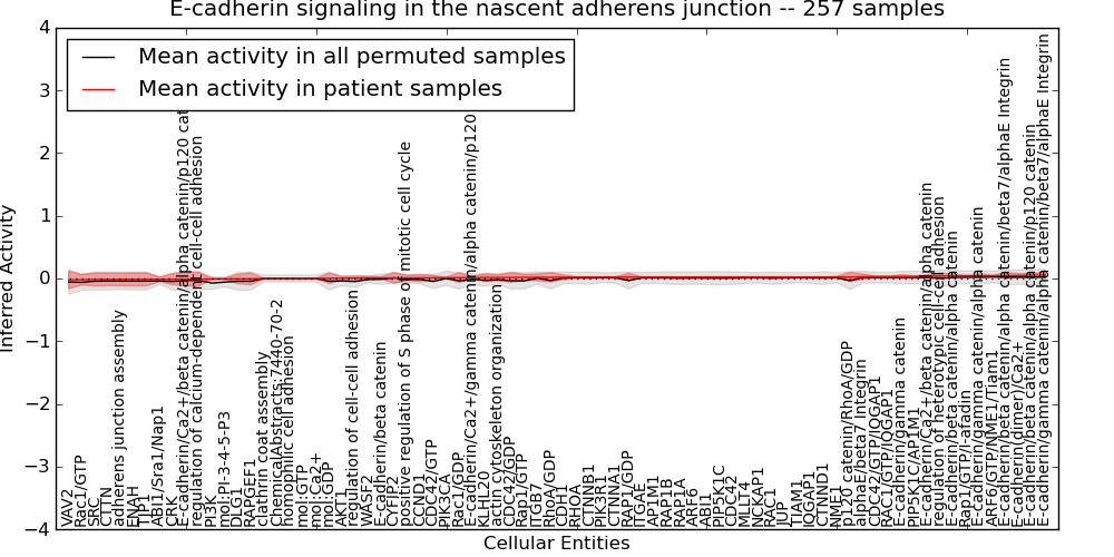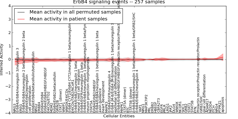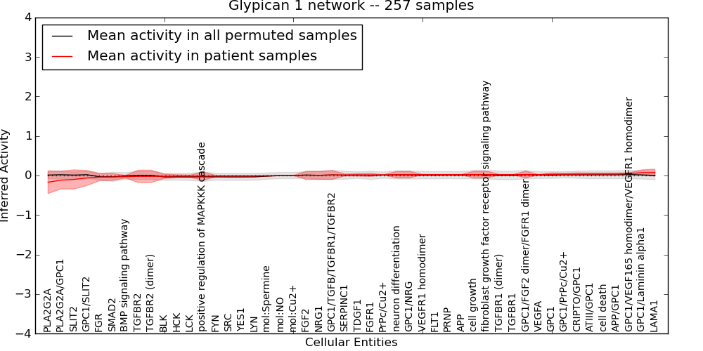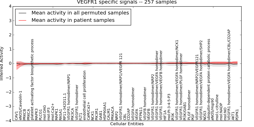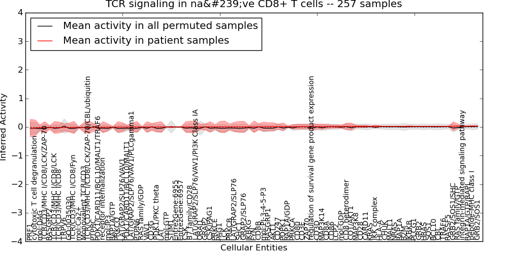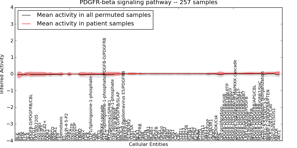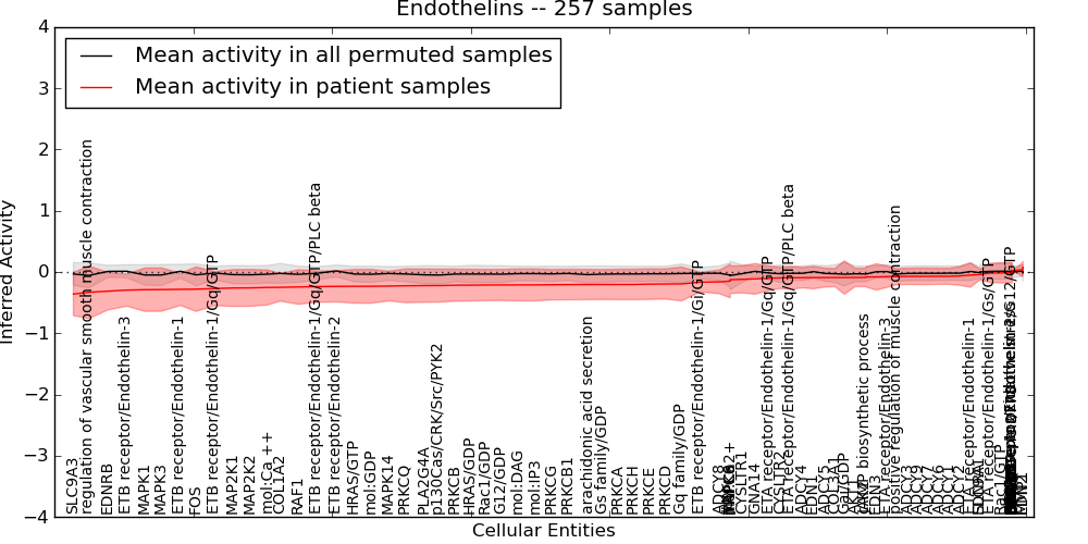 Figure S131. Get High-res Image This plot shows pathway concept perturbations across all samples against a permutation model. The concepts along the x-axis are sorted by lowest to highest mean activity for the real patient samples. Mean inferred activities are plotted along the y-axis as a colored band showing the average level and one standard deviation range. Real samples are shown in red and permuted samples in black.