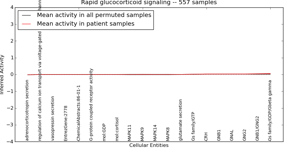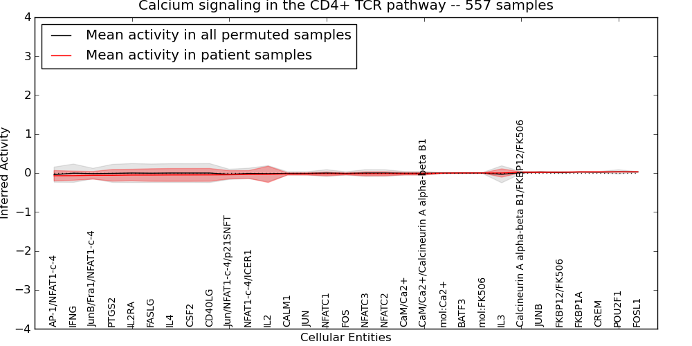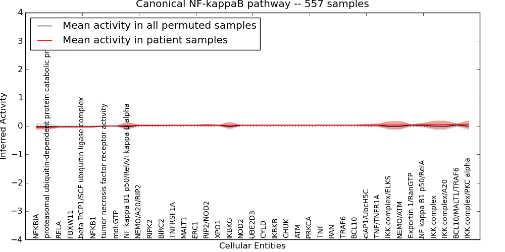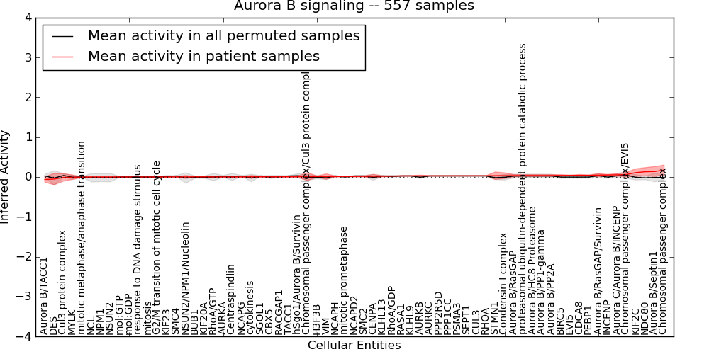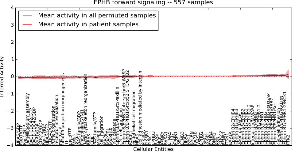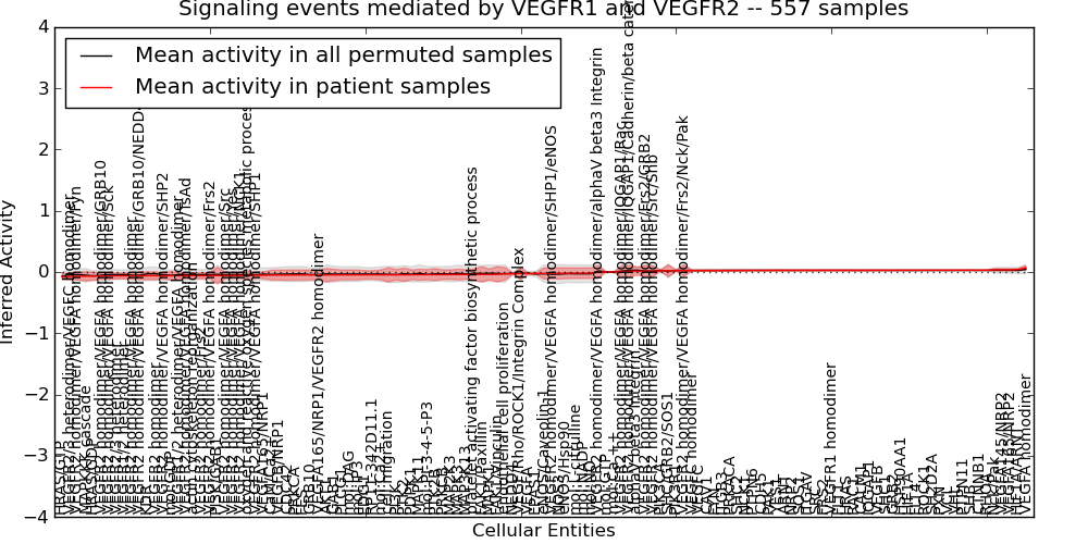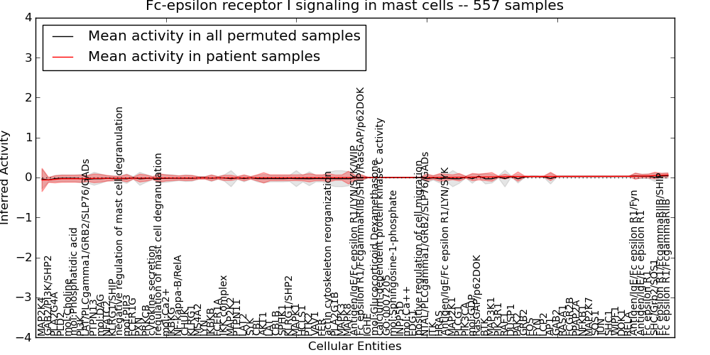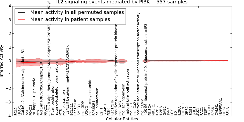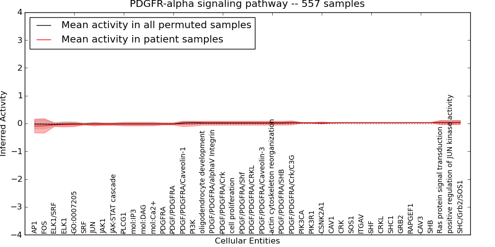 Figure S131. Get High-res Image This plot shows pathway concept perturbations across all samples against a permutation model. The concepts along the x-axis are sorted by lowest to highest mean activity for the real patient samples. Mean inferred activities are plotted along the y-axis as a colored band showing the average level and one standard deviation range. Real samples are shown in red and permuted samples in black.
