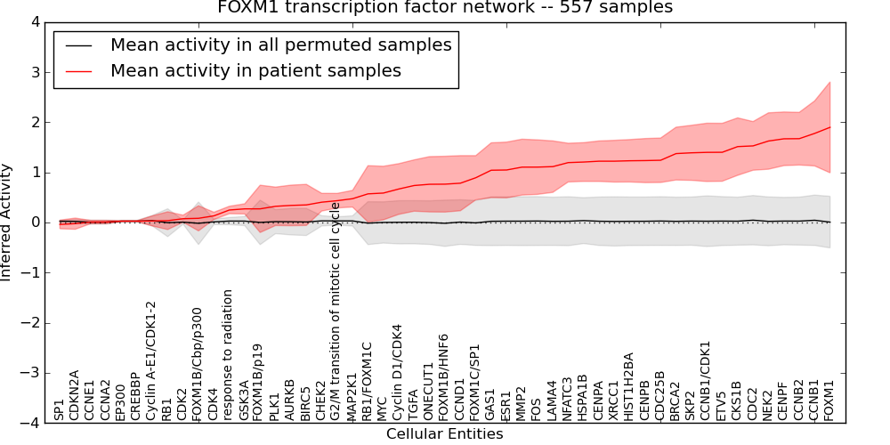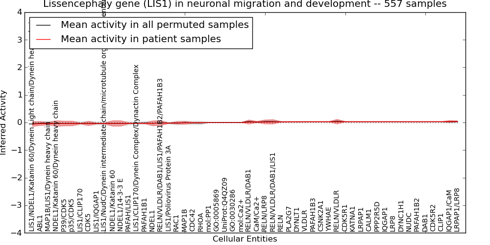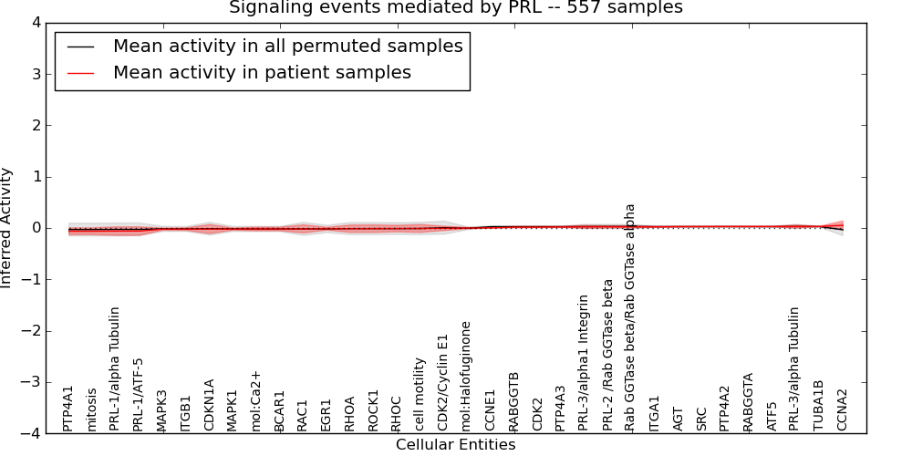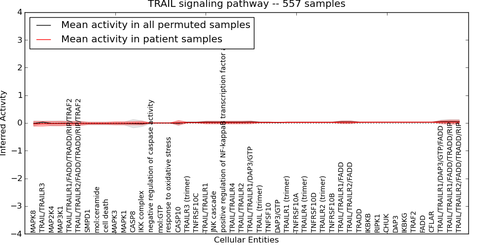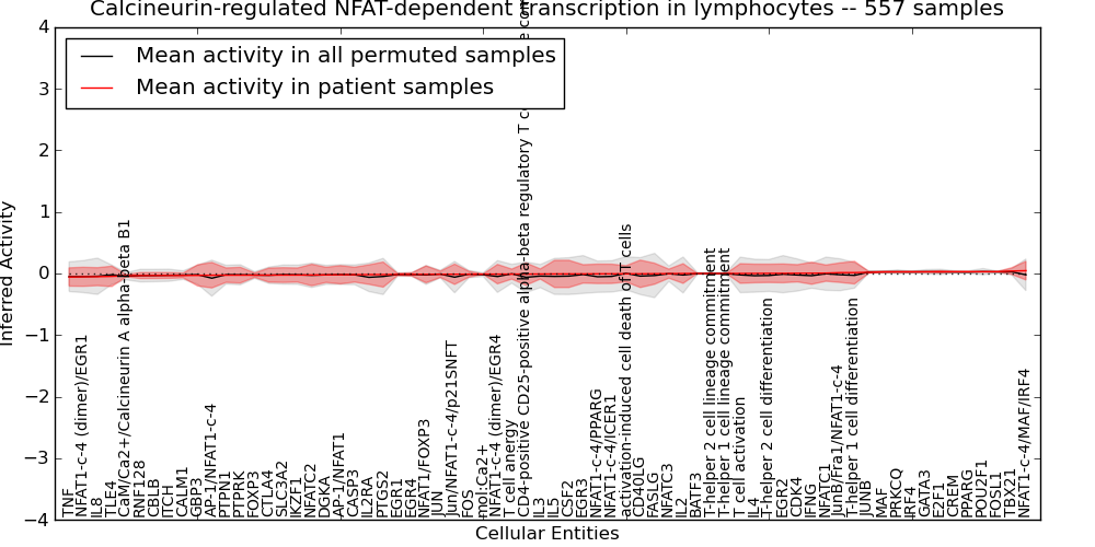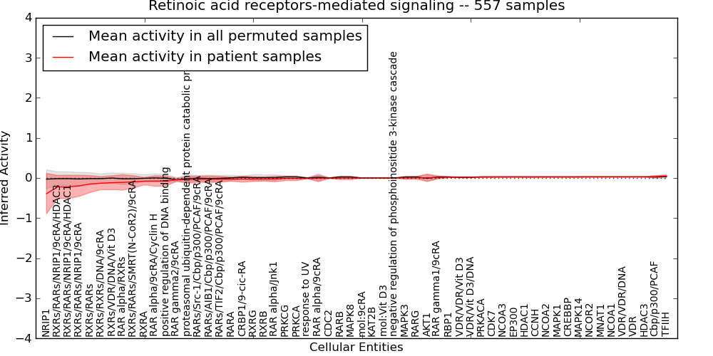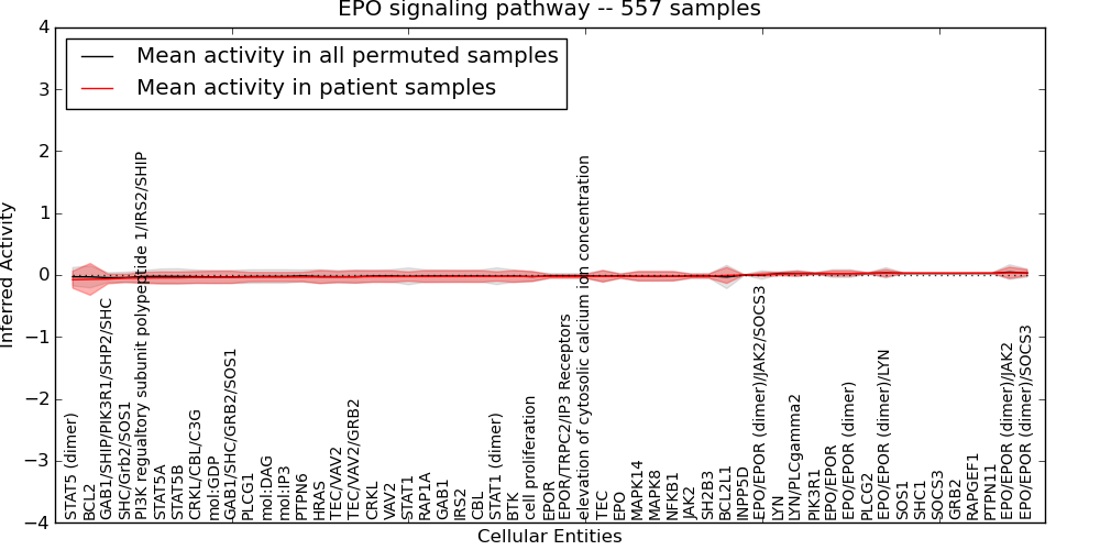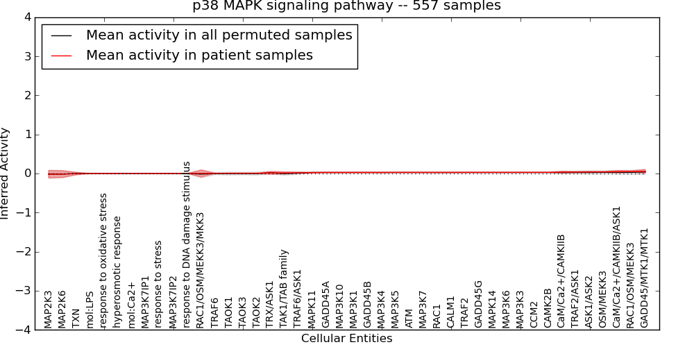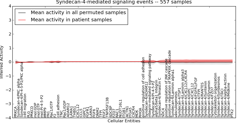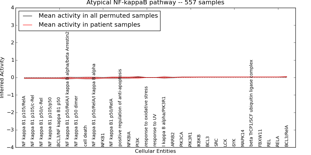 Figure S131. Get High-res Image This plot shows pathway concept perturbations across all samples against a permutation model. The concepts along the x-axis are sorted by lowest to highest mean activity for the real patient samples. Mean inferred activities are plotted along the y-axis as a colored band showing the average level and one standard deviation range. Real samples are shown in red and permuted samples in black.