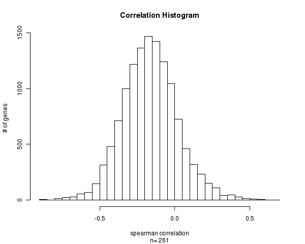 Figure 1. Histogram of methylation correlation values. n is the number of matched samples between Level 3 CpG site methylation and Level 3 gene expression arrays. Number of Matched Samples = 261