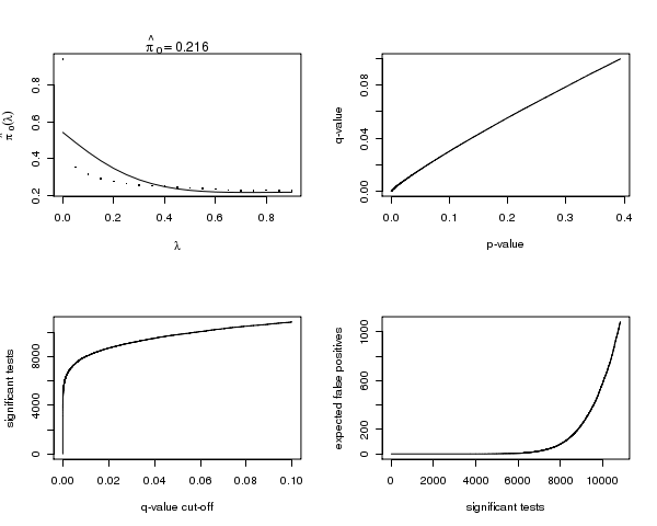 Figure 2. Plot 1. The estimated pi_0 versus the tuning parameter lambda. Plot 2. The q-values versus the p-values. Plot 3. The number of significant tests versus each q-value cutoff. Plot 4. The number of expected false positives versus the number of significant tests.The first is a plot of the estimate of pi_0 versus its tuning parameter lambda. In most cases, as lambda gets larger, the bias of the estimate decreases, yet the variance increases. Comparing your estimate of pi_0 to this plot allows one to guage its quality. The remaining three plots show how many tests are significant, as well as how many false positives to expect for each q-value cut-off.