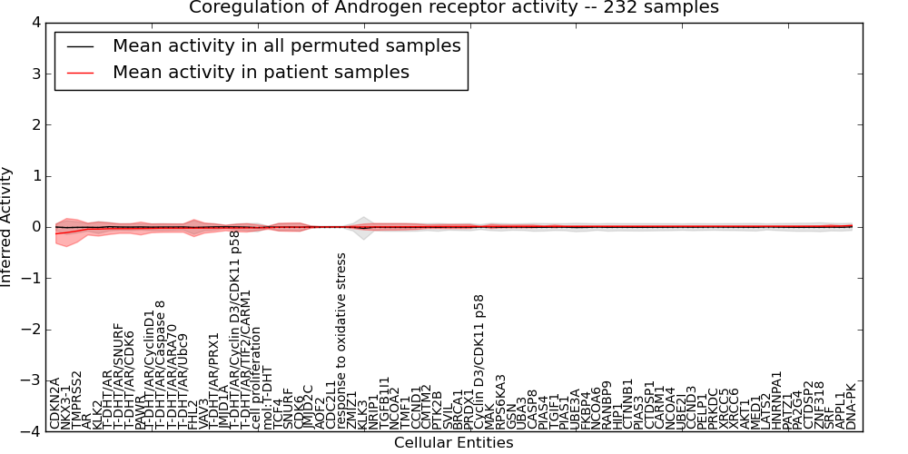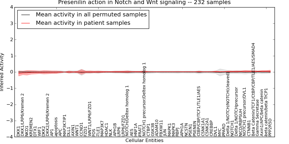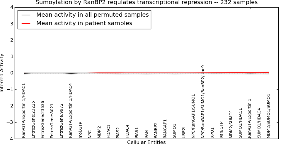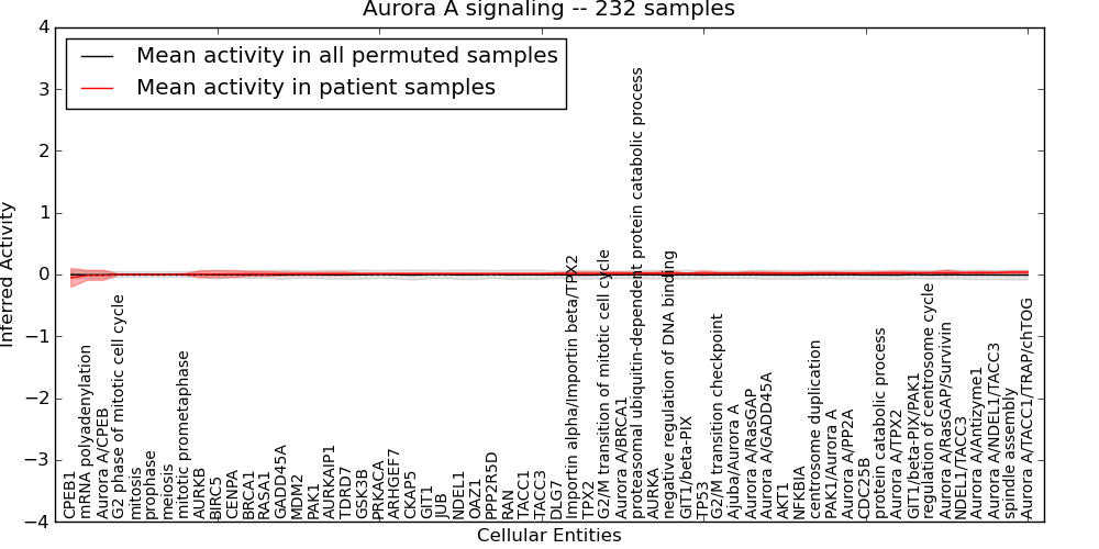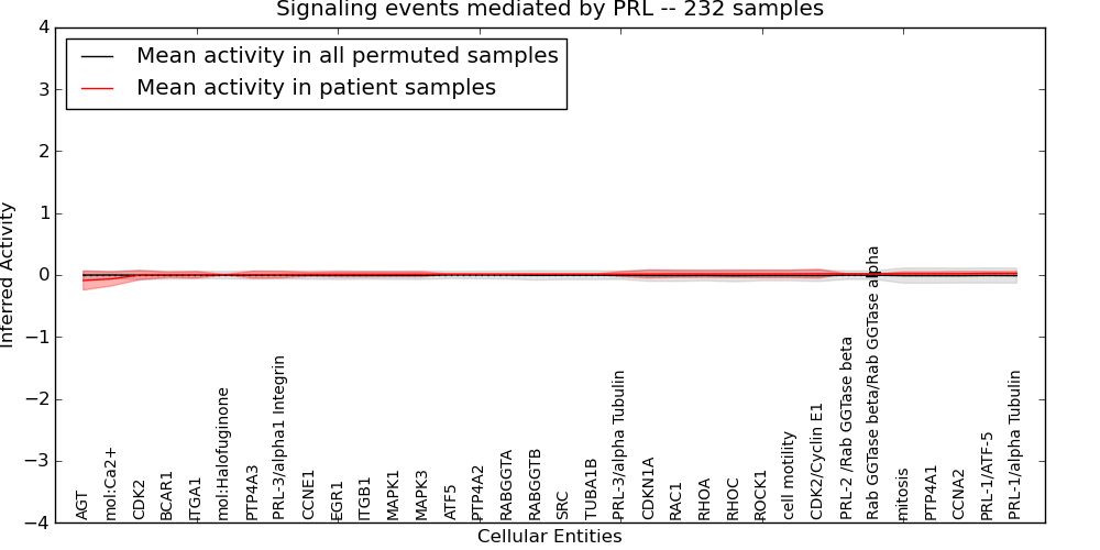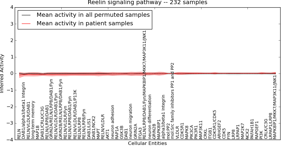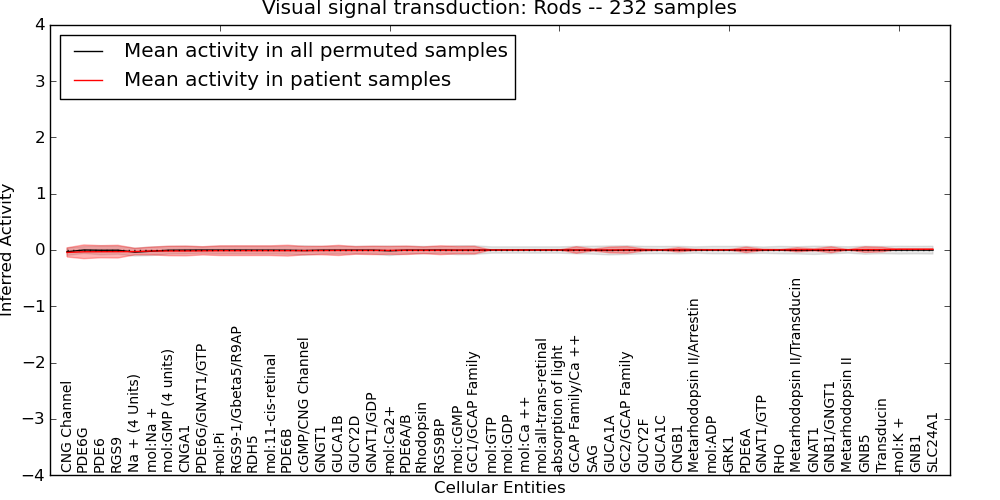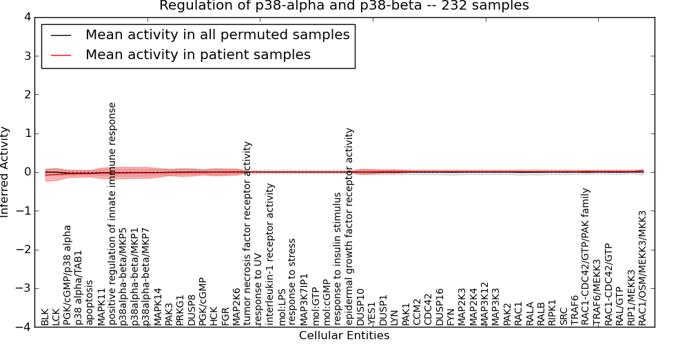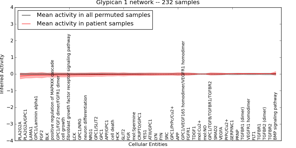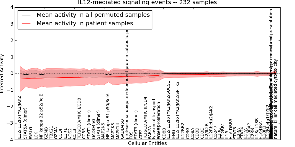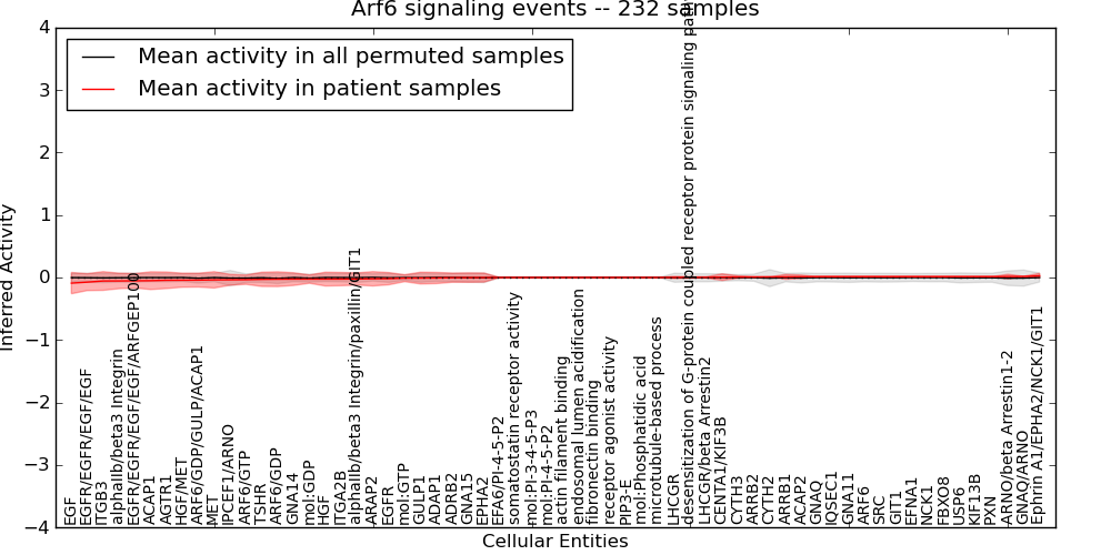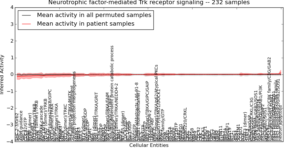 Figure S131.  Get High-res Image This plot shows pathway concept perturbations across all samples against a permutation model. The concepts along the x-axis are sorted by lowest to highest mean activity for the real patient samples. Mean inferred activities are plotted along the y-axis as a colored band showing the average level and one standard deviation range. Real samples are shown in red and permuted samples in black.