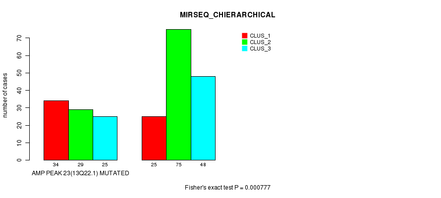 Amp Peak 23(13q22.1) cnvs correlated to 'CN_CNMF' and 'MIRSEQ_CHIERARCHICAL'.