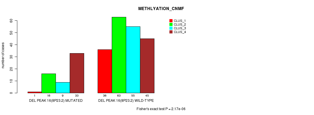 Del Peak 16(8p23.2) cnvs correlated to 'CN_CNMF', 'METHLYATION_CNMF', and 'MIRSEQ_CHIERARCHICAL'.