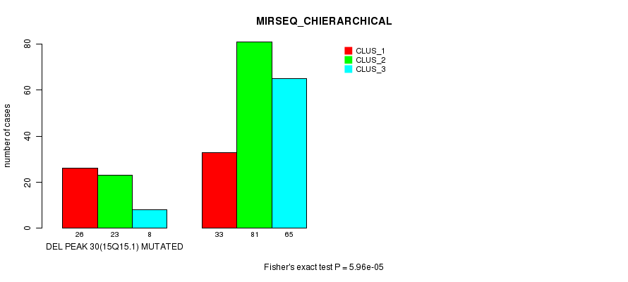 Del Peak 30(15q15.1) cnvs correlated to 'CN_CNMF', 'METHLYATION_CNMF', and 'MIRSEQ_CHIERARCHICAL'.