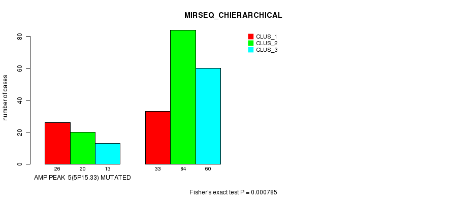 Amp Peak 5(5p15.33) cnvs correlated to 'CN_CNMF', 'METHLYATION_CNMF', and 'MIRSEQ_CHIERARCHICAL'.