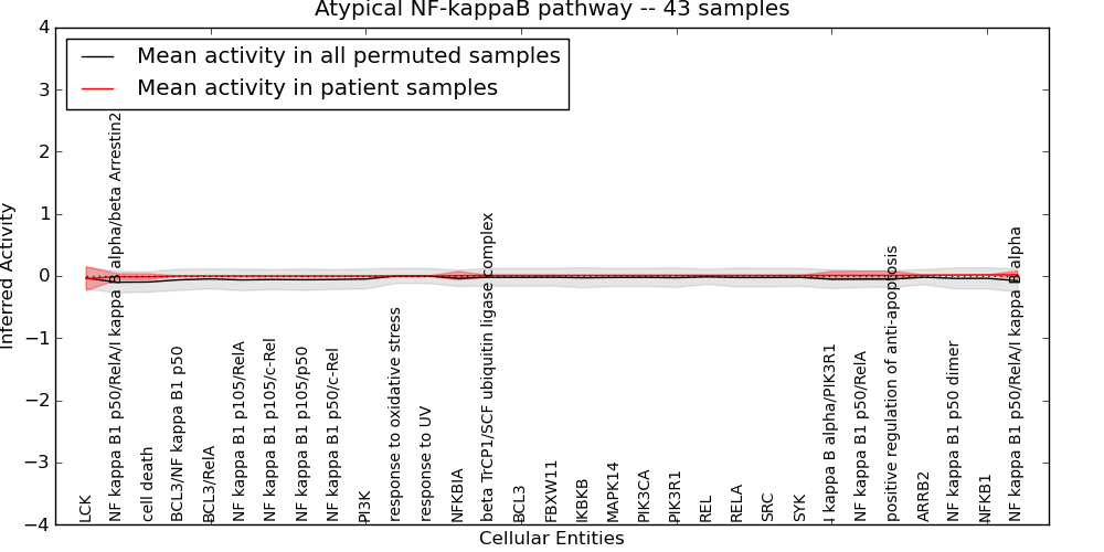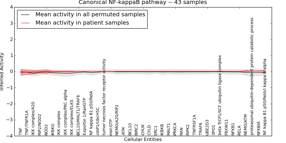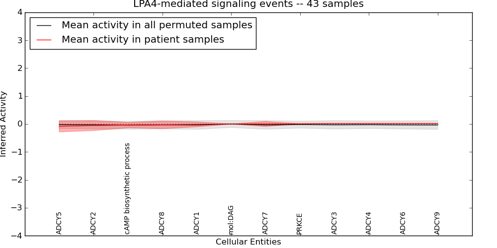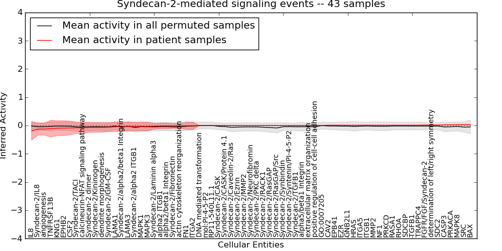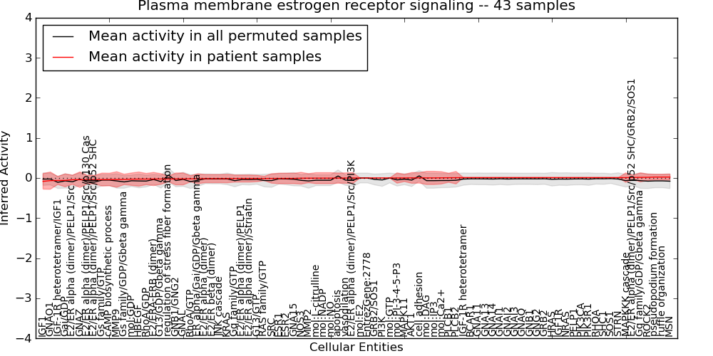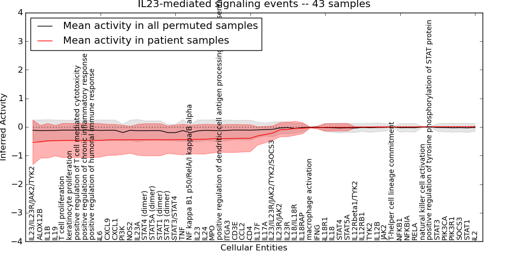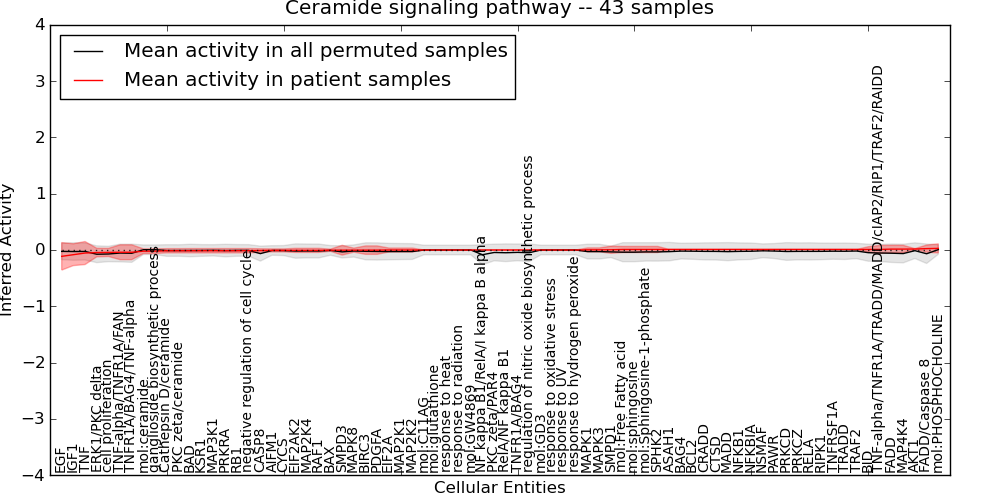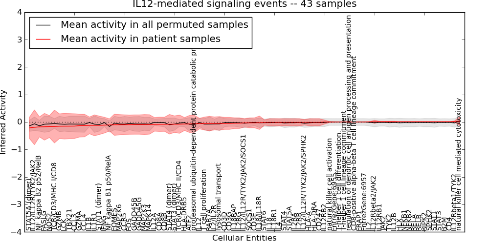 Figure S131. Get High-res Image This plot shows pathway concept perturbations across all samples against a permutation model. The concepts along the x-axis are sorted by lowest to highest mean activity for the real patient samples. Mean inferred activities are plotted along the y-axis as a colored band showing the average level and one standard deviation range. Real samples are shown in red and permuted samples in black.