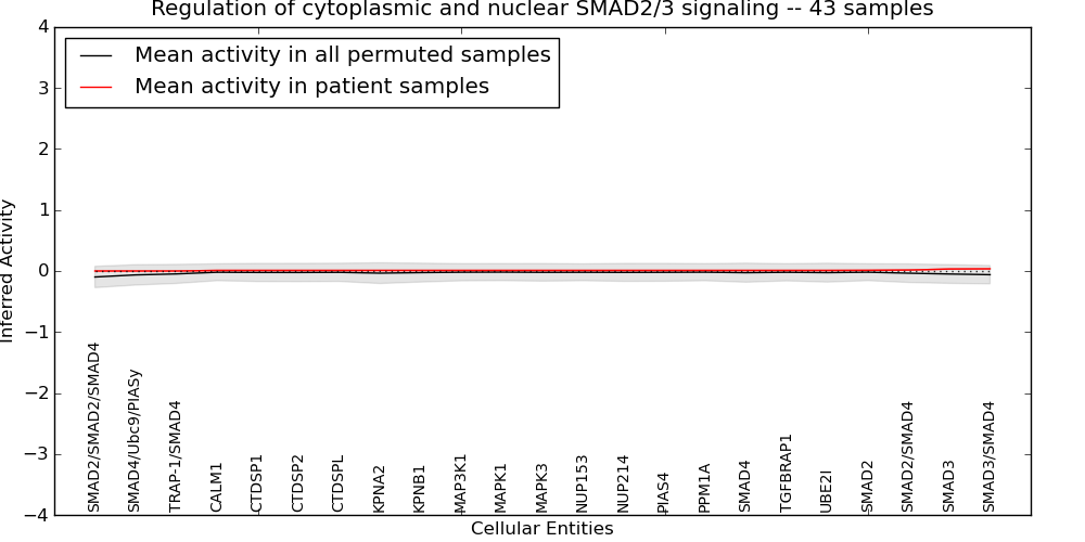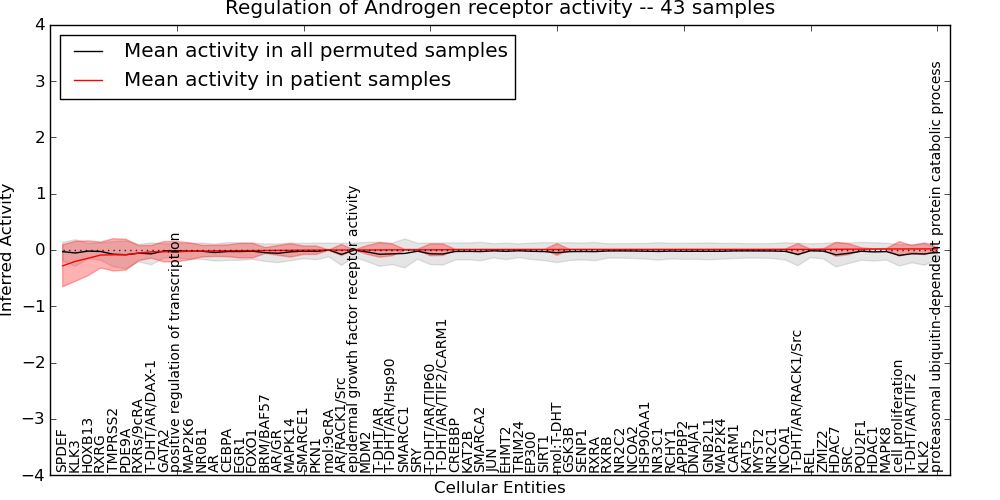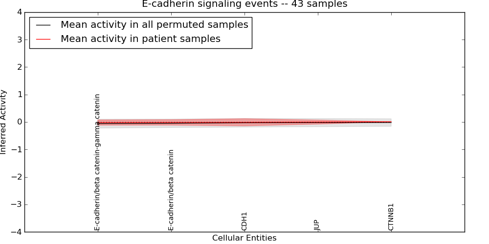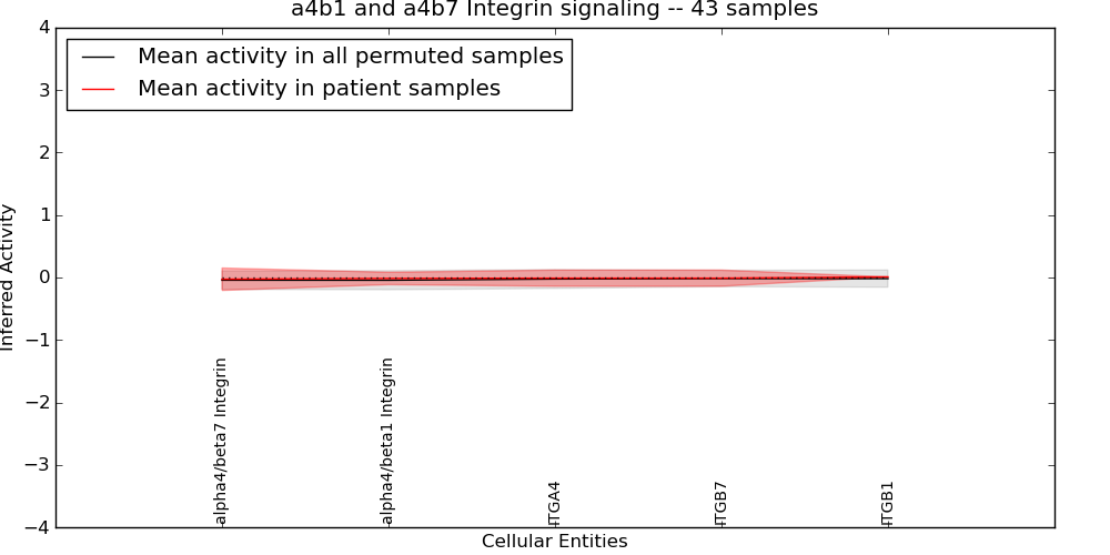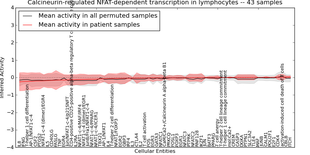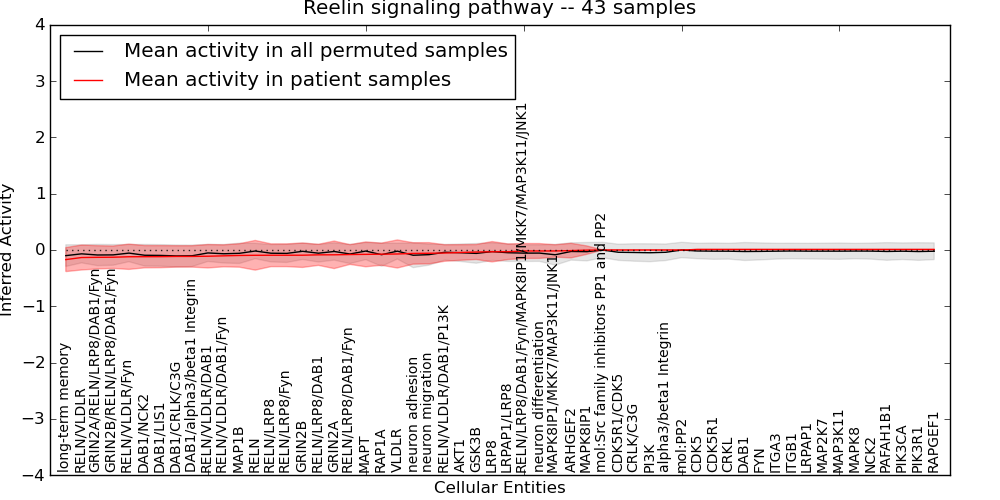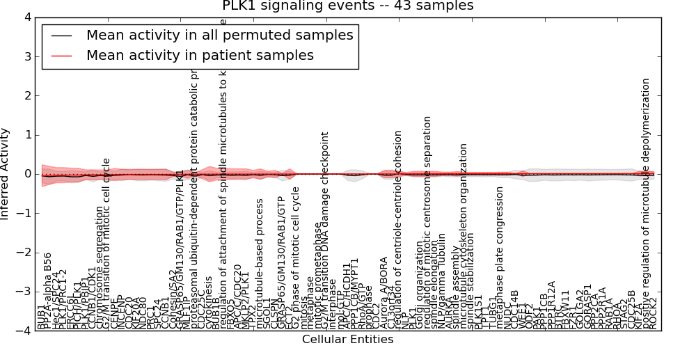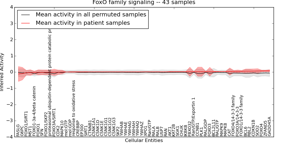 Figure S131. Get High-res Image This plot shows pathway concept perturbations across all samples against a permutation model. The concepts along the x-axis are sorted by lowest to highest mean activity for the real patient samples. Mean inferred activities are plotted along the y-axis as a colored band showing the average level and one standard deviation range. Real samples are shown in red and permuted samples in black.