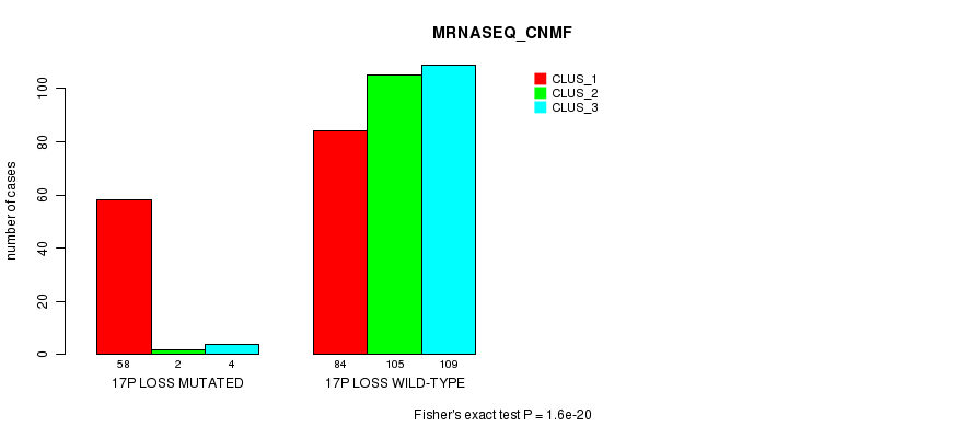 17p loss cnv correlated to 'CN_CNMF', 'METHLYATION_CNMF', 'MRNASEQ_CNMF', 'MRNASEQ_CHIERARCHICAL', 'MIRSEQ_CNMF', and 'MIRSEQ_CHIERARCHICAL'.