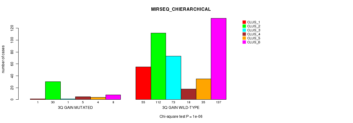 3q gain cnv correlated to 'CN_CNMF', 'METHLYATION_CNMF', 'MRNASEQ_CNMF', 'MRNASEQ_CHIERARCHICAL', and 'MIRSEQ_CHIERARCHICAL'.