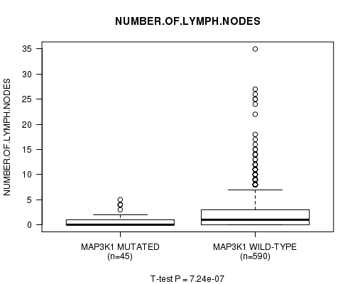MAP3K1 mutation correlated to 'NUMBER.OF.LYMPH.NODES'.