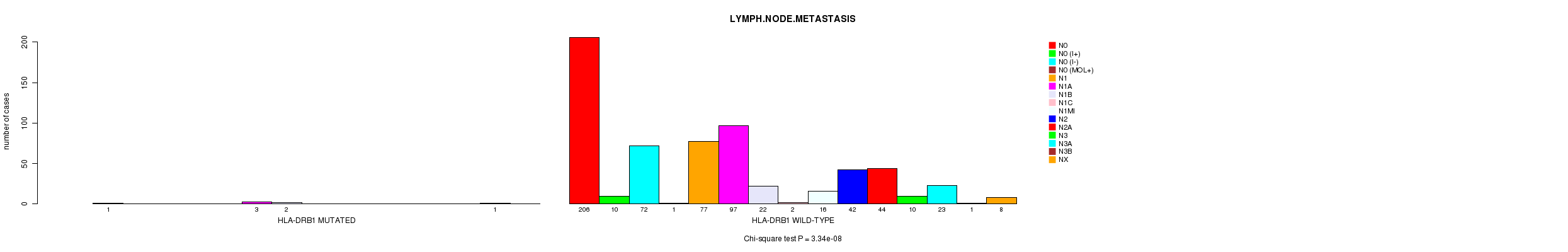 HLA-DRB1 mutation correlated to 'LYMPH.NODE.METASTASIS'.