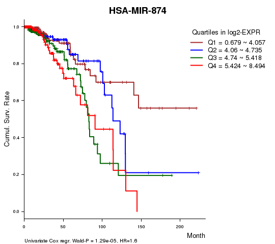 Figure S1. Get High-res Image As an example, this figure shows the association of HSA-MIR-874 to 'Time to Death'. four curves present the cumulative survival rates of 4 quartile subsets of patients. P value = 1.29e-05 with univariate Cox regression analysis using continuous log-2 expression values.