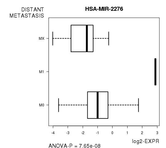 Figure S3. Get High-res Image As an example, this figure shows the association of HSA-MIR-2276 to 'DISTANT.METASTASIS'. P value = 7.65e-08 with ANOVA analysis.