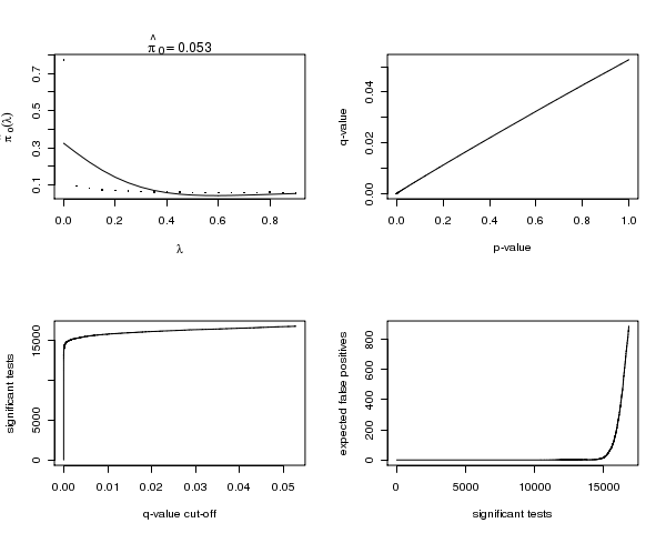 Figure 2. Plot 1. The estimated pi_0 versus the tuning parameter lambda. Plot 2. The q-values versus the p-values. Plot 3. The number of significant tests versus each q-value cutoff. Plot 4. The number of expected false positives versus the number of significant tests.The first is a plot of the estimate of pi_0 versus its tuning parameter lambda. In most cases, as lambda gets larger, the bias of the estimate decreases, yet the variance increases. Comparing your estimate of pi_0 to this plot allows one to guage its quality. The remaining three plots show how many tests are significant, as well as how many false positives to expect for each q-value cut-off.