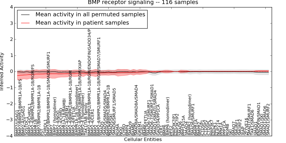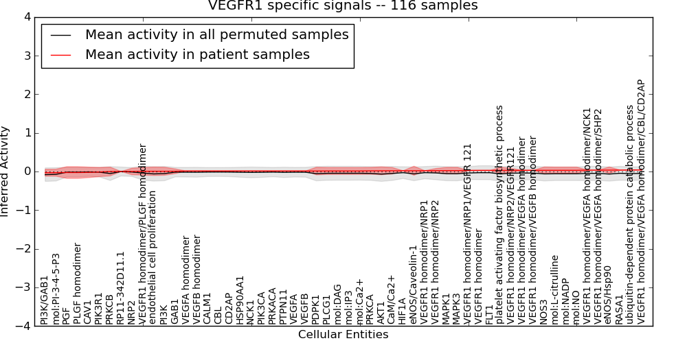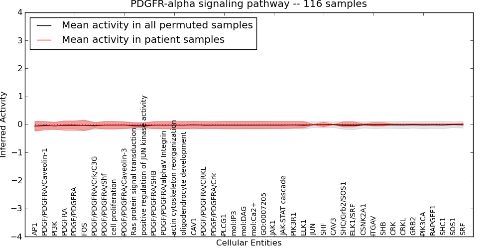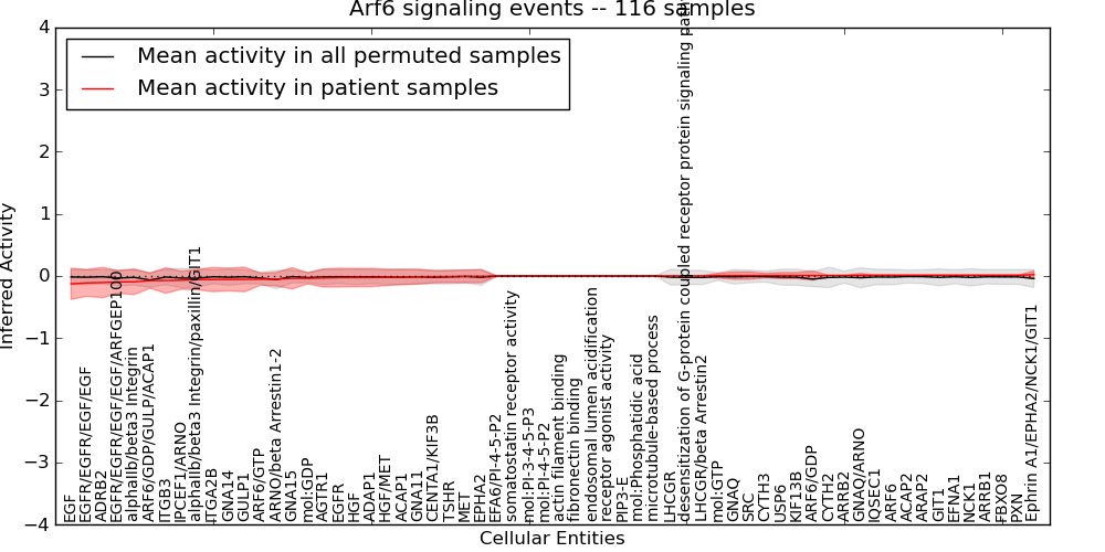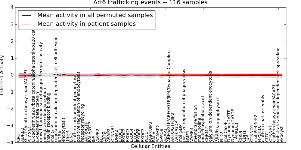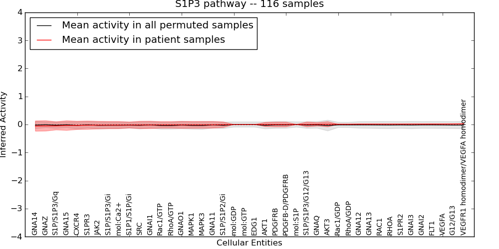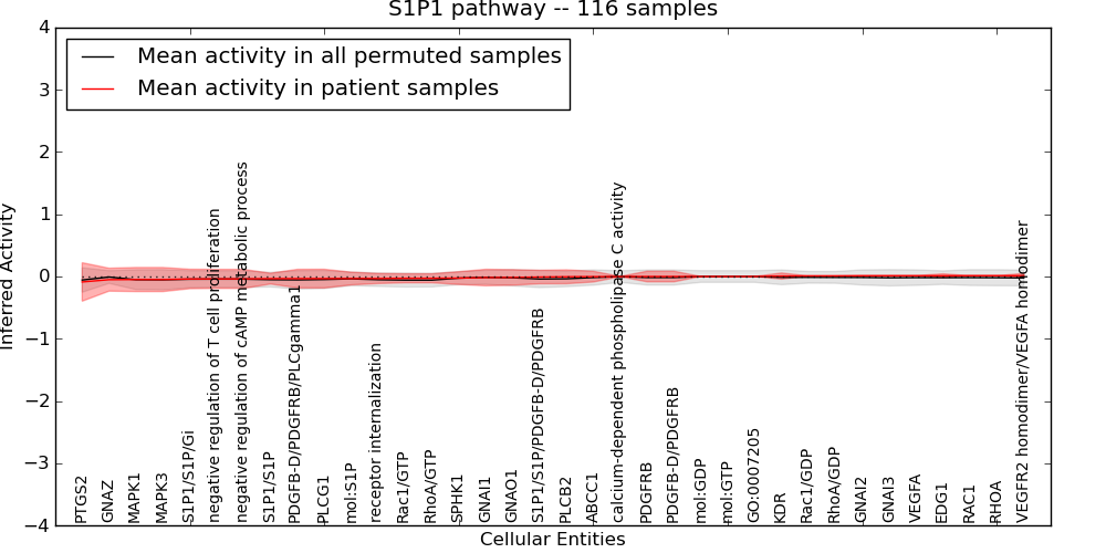Figure S131. Get High-res Image This plot shows pathway concept perturbations across all samples against a permutation model. The concepts along the x-axis are sorted by lowest to highest mean activity for the real patient samples. Mean inferred activities are plotted along the y-axis as a colored band showing the average level and one standard deviation range. Real samples are shown in red and permuted samples in black.