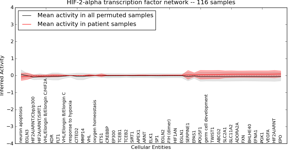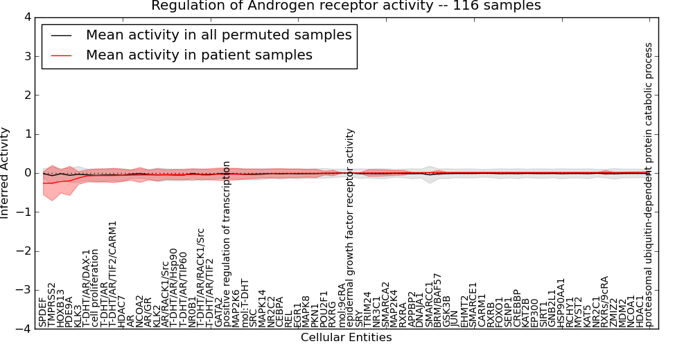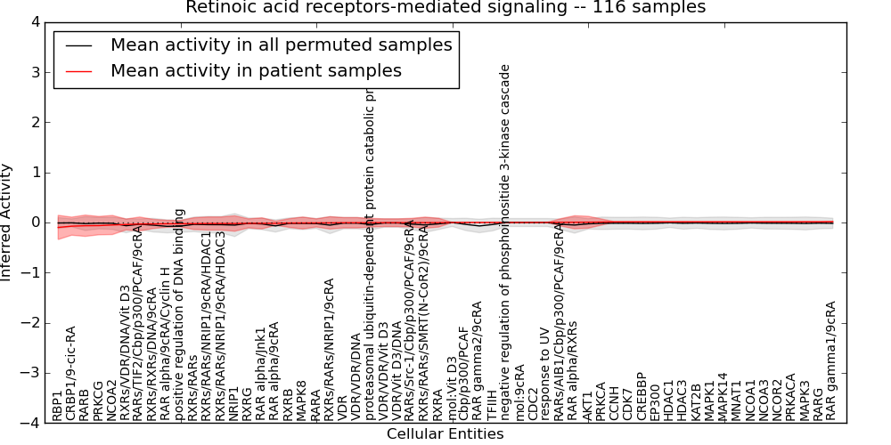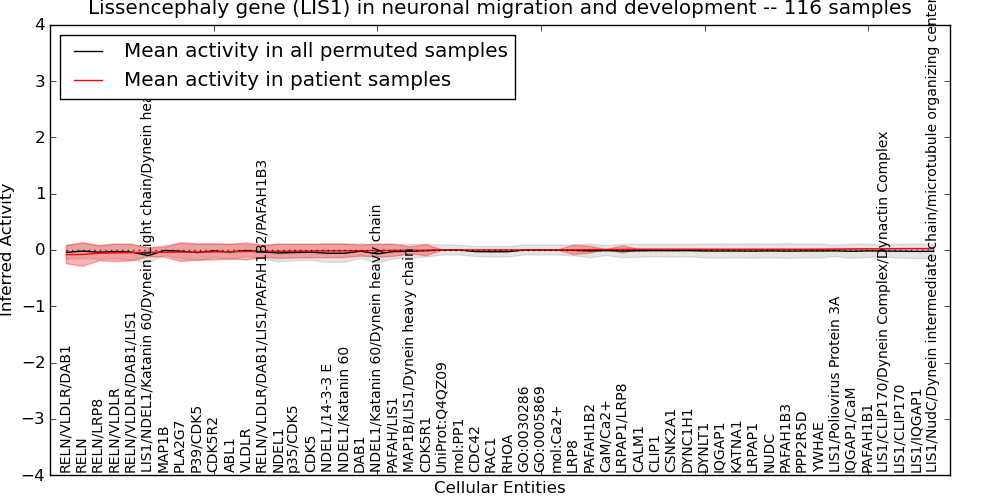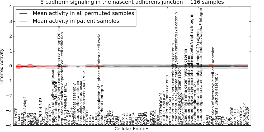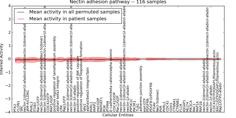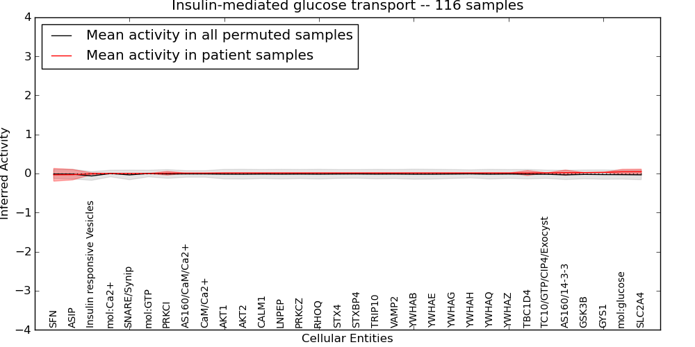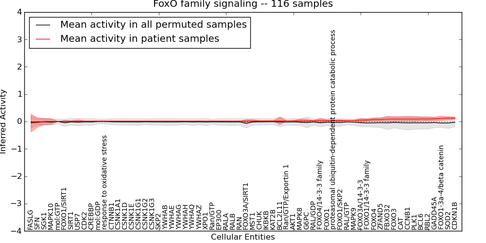 Figure S131. Get High-res Image This plot shows pathway concept perturbations across all samples against a permutation model. The concepts along the x-axis are sorted by lowest to highest mean activity for the real patient samples. Mean inferred activities are plotted along the y-axis as a colored band showing the average level and one standard deviation range. Real samples are shown in red and permuted samples in black.