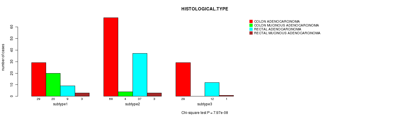 Consensus hierarchical clustering analysis on array-based mRNA expression data identified 3 subtypes that correlate to 'HISTOLOGICAL.TYPE'.