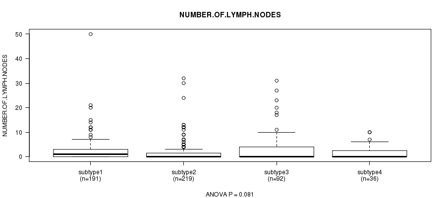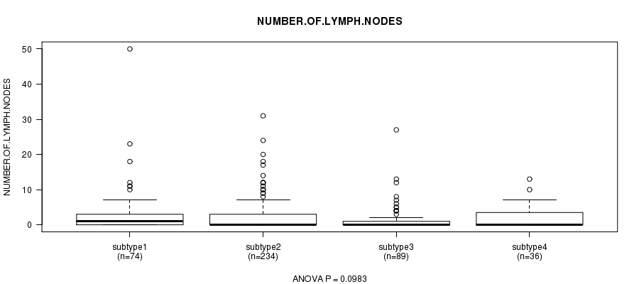 Figure S120. Get High-res Image Clustering Approach #10: 'MIRSEQ CHIERARCHICAL' versus Clinical Feature #12: 'NUMBER.OF.LYMPH.NODES'