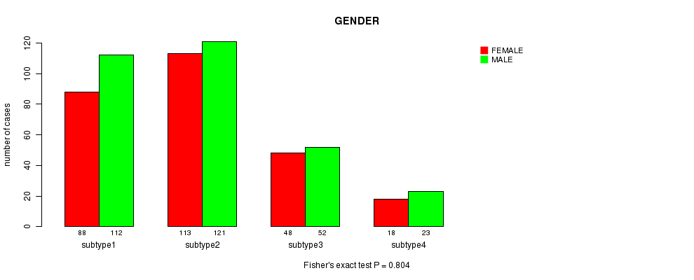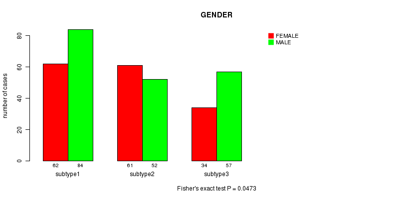 Table S122. Clustering Approach #10: 'MIRSEQ CHIERARCHICAL' versus Clinical Feature #4: 'GENDER'