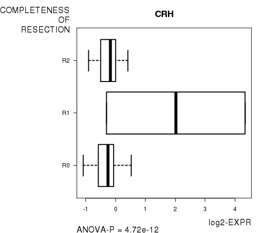Figure S6. Get High-res Image As an example, this figure shows the association of CRH to 'COMPLETENESS.OF.RESECTION'. P value = 4.72e-12 with ANOVA analysis.