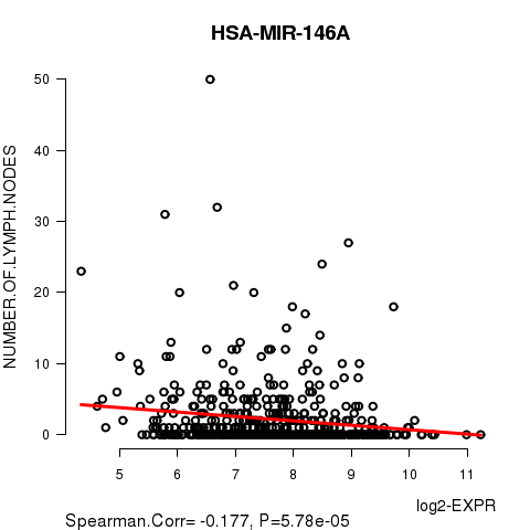 Figure S10. Get High-res Image As an example, this figure shows the association of HSA-MIR-146A to 'NUMBER.OF.LYMPH.NODES'. P value = 5.78e-05 with Spearman correlation analysis. The straight line presents the best linear regression.