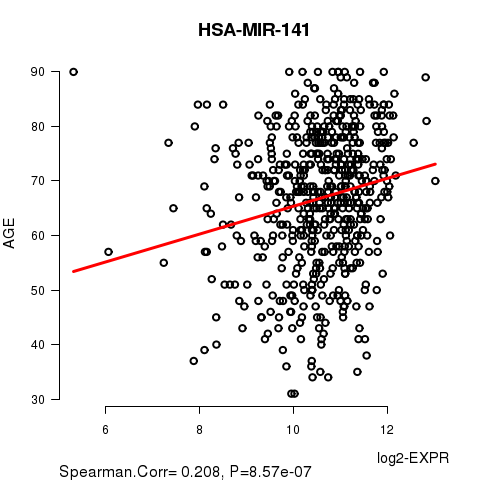 Figure S1. Get High-res Image As an example, this figure shows the association of HSA-MIR-141 to 'AGE'. P value = 8.57e-07 with Spearman correlation analysis. The straight line presents the best linear regression.