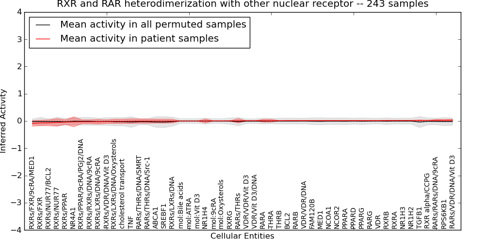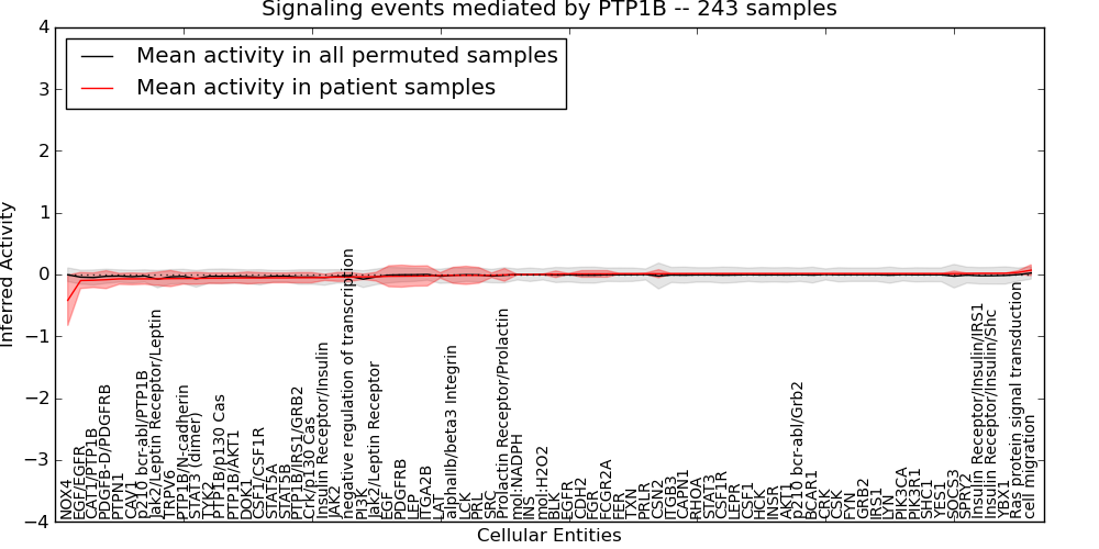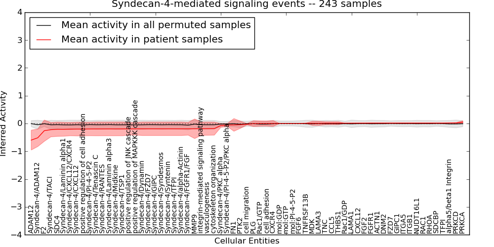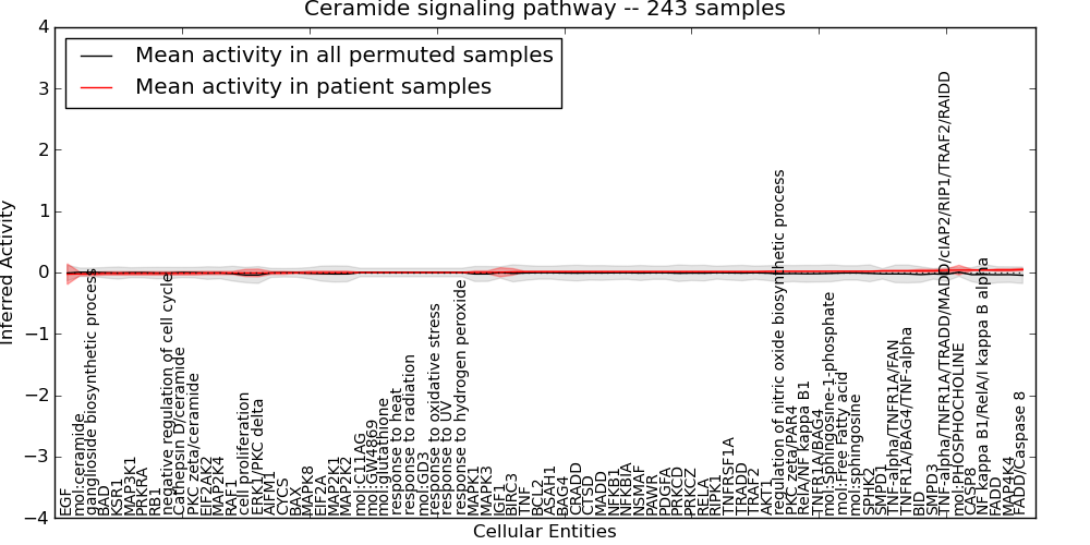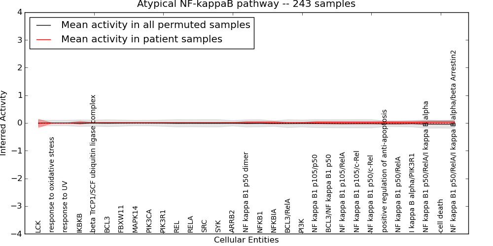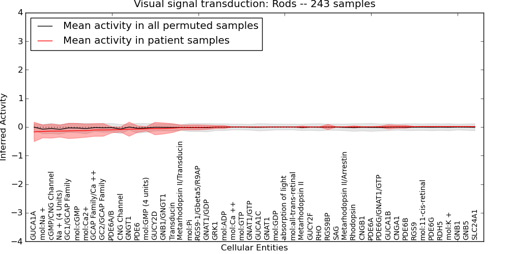 Figure S131.  Get High-res Image This plot shows pathway concept perturbations across all samples against a permutation model. The concepts along the x-axis are sorted by lowest to highest mean activity for the real patient samples. Mean inferred activities are plotted along the y-axis as a colored band showing the average level and one standard deviation range. Real samples are shown in red and permuted samples in black.