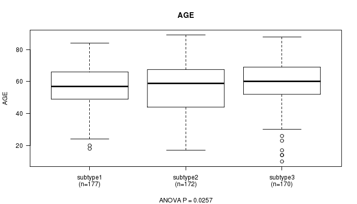 Consensus hierarchical clustering analysis on array-based miR expression data identified 3 subtypes that correlate to 'AGE'.