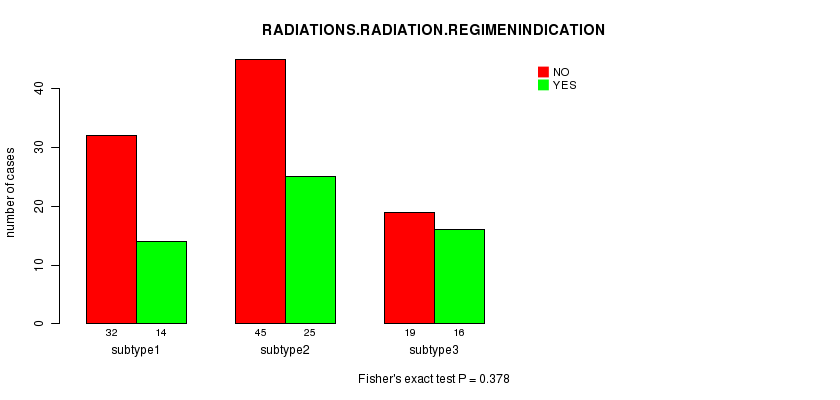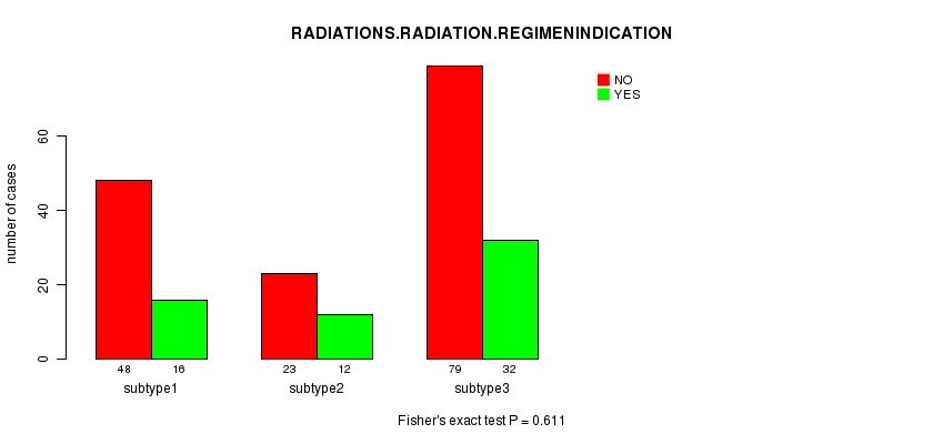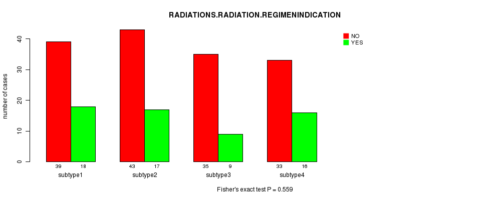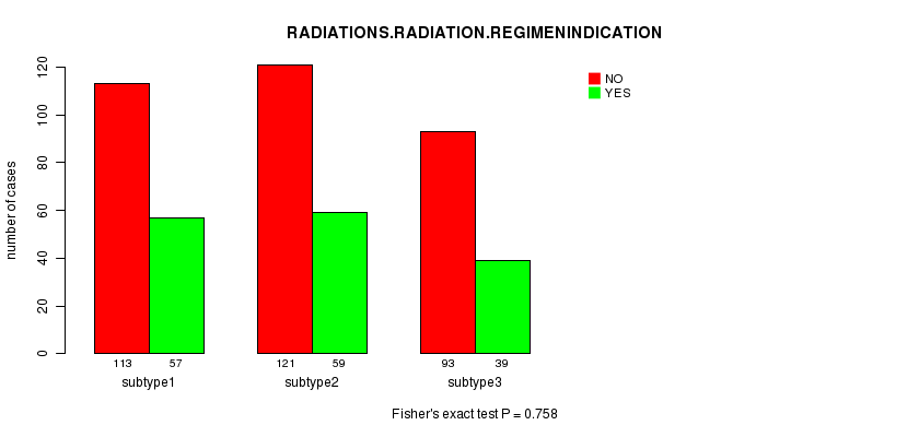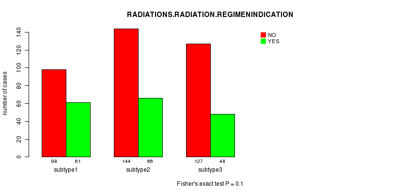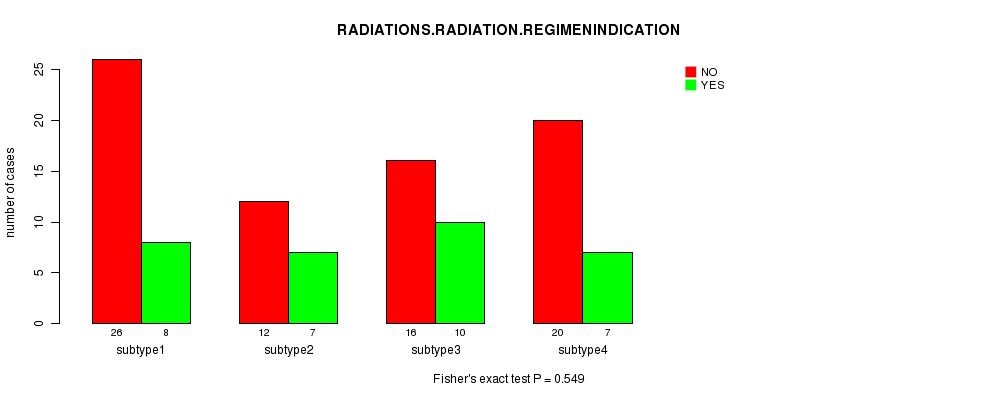 Figure S50. Get High-res Image Clustering Approach #10: 'RNAseq cHierClus subtypes' versus Clinical Feature #5: 'RADIATIONS.RADIATION.REGIMENINDICATION'