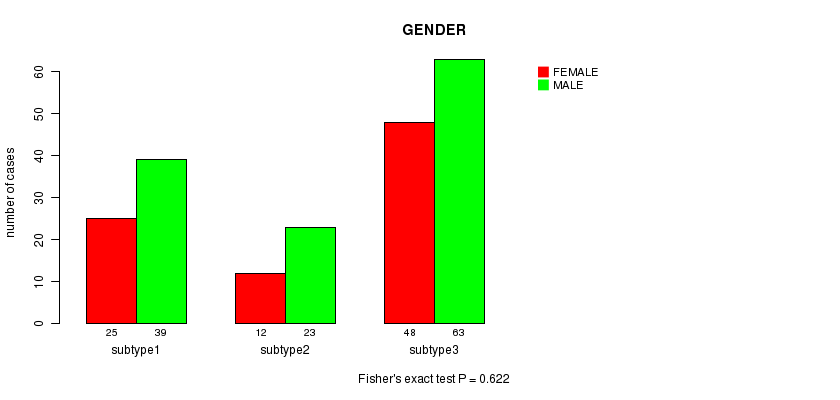 Table S52. Clustering Approach #9: 'RNAseq CNMF subtypes' versus Clinical Feature #3: 'GENDER'