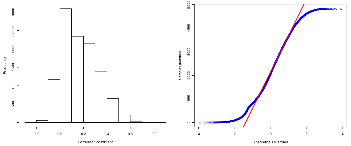 Figure 1. Summary figures. Left: histogram showing the distribution of the calculated correlations across samples for all Genes. Right: QQ plot of the calculated correlations across samples. The QQ plot is used to plot the quantiles of the calculated correlation coefficients against that derived from a normal distribution. Points deviating from the blue line indicate deviation from normality.