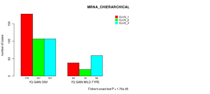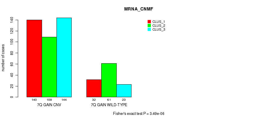 7q gain cnv correlated to 'MRNA_CNMF', 'MRNA_CHIERARCHICAL', 'MIR_CHIERARCHICAL', and 'CN_CNMF'.